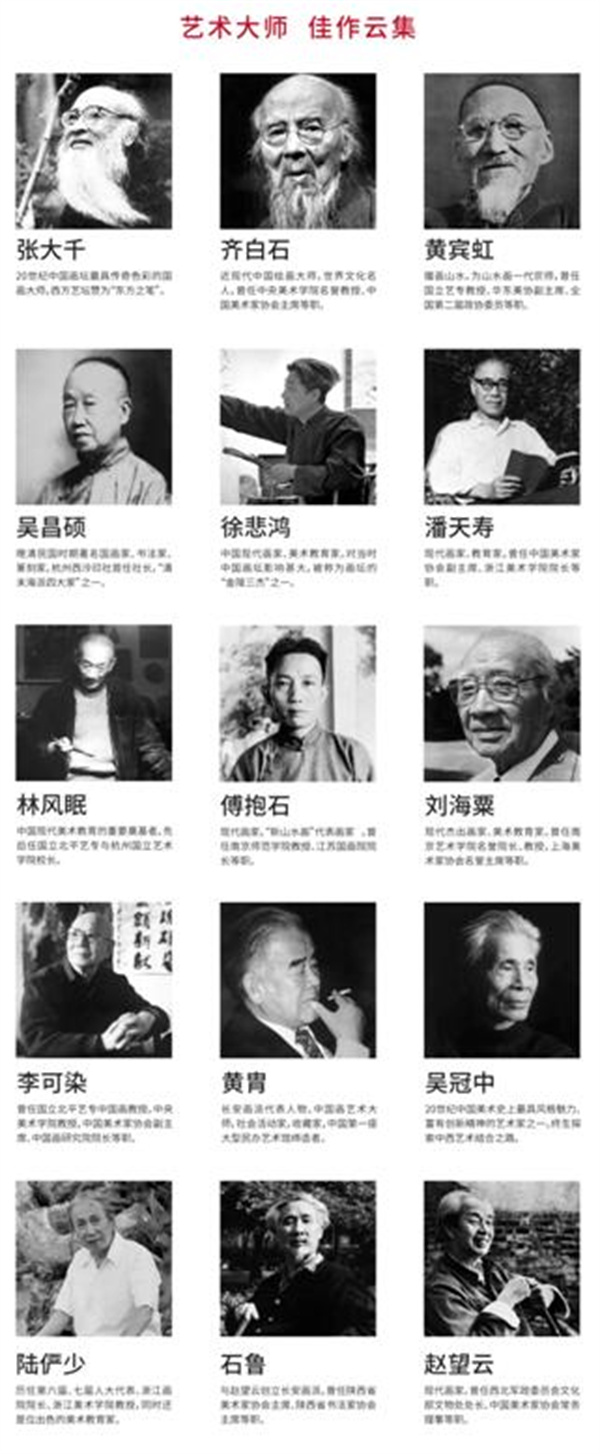 主承辦方精心挑選了 100幅經典藝術藏品參與本場藝術公益大展,分別呈現不同的重要主題,分為「紅色足跡」、「奮鬥歷程」、「走向輝煌」三大板塊。展品包含了張大千、齊白石、黃賓虹、吳昌碩、徐悲鴻、潘天壽、林風眠、李可染、傅抱石、劉海粟、黃胄、吳冠中等近40位近現代大師的經典大型力作,極具震撼力,以大家熟悉的經典山川、經典故事、經典人物為創作題材,藝術化展現了中國共產黨的光榮歷史和不朽功勳,表現了藝術家對黨和人民的無限熱愛。此次展覽精心呈現的100件作品,有從正面展現中國共產黨砥礪前行、勇敢奮進的革命史詩;也有通過對人民生活的紀錄與謳歌,從側面展現新中國建設過程的點點滴滴;有「細微之處見真章」,從平凡事物中表達對美好現實的希望;也有「寫盡山河頌家國」——藉助恢弘壯美的山水,抒發對祖國大好河山的讚美與崇敬。