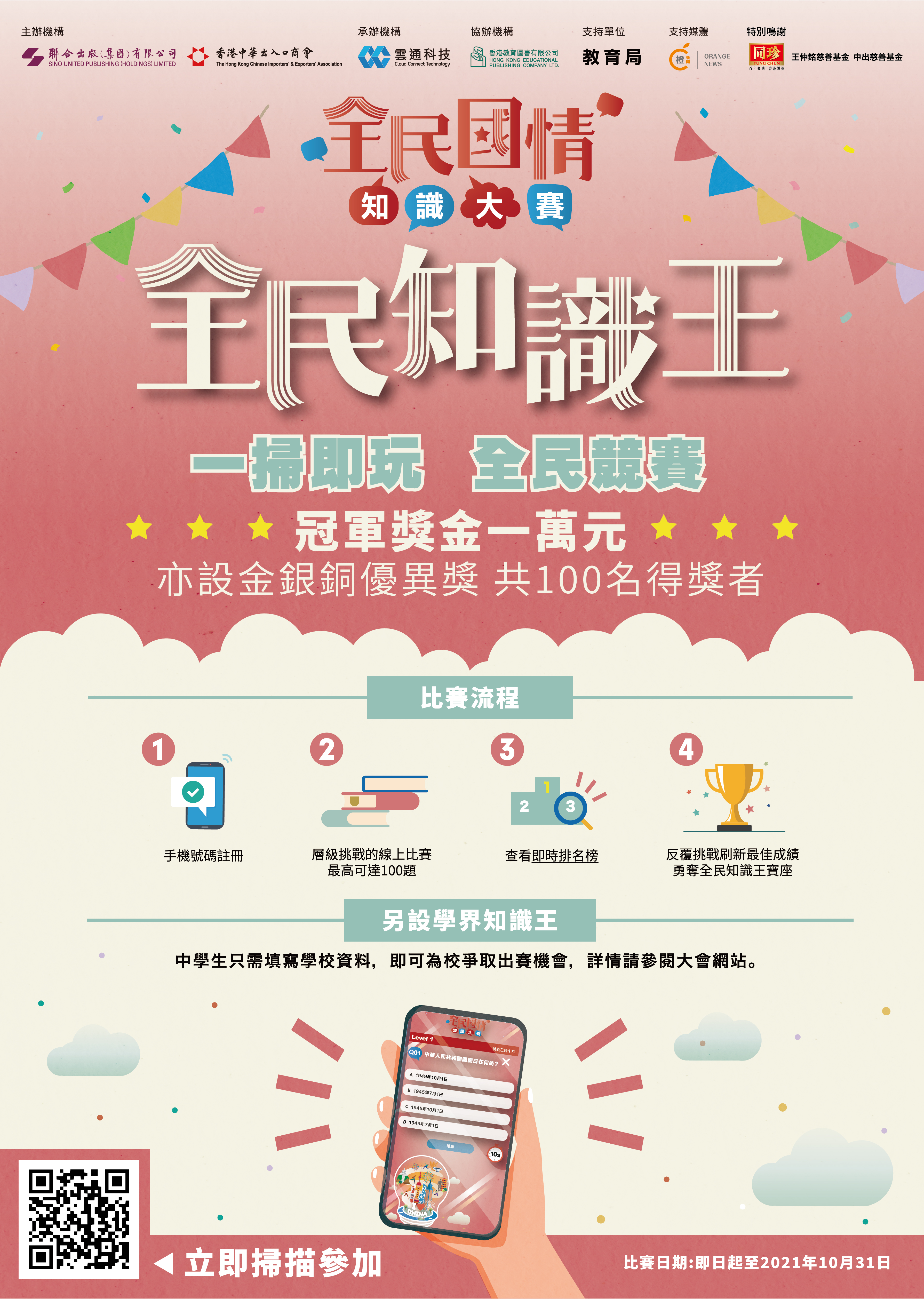 為加深全港市民及學生對中國歷史文化國情的認識,聯合出版集團、香港中華出入口商會聯合主辦「全民國情知識大賽」現已展開,涵蓋中國歷史、文化、時事等多個重要題目範疇,透過線上輕鬆簡易的選擇題比賽方式,鞏固參加者的知識和興趣。大賽設有「全民知識王」邀請全港市民參加競逐,及「學界知識王」邀請全港中學報名參加。