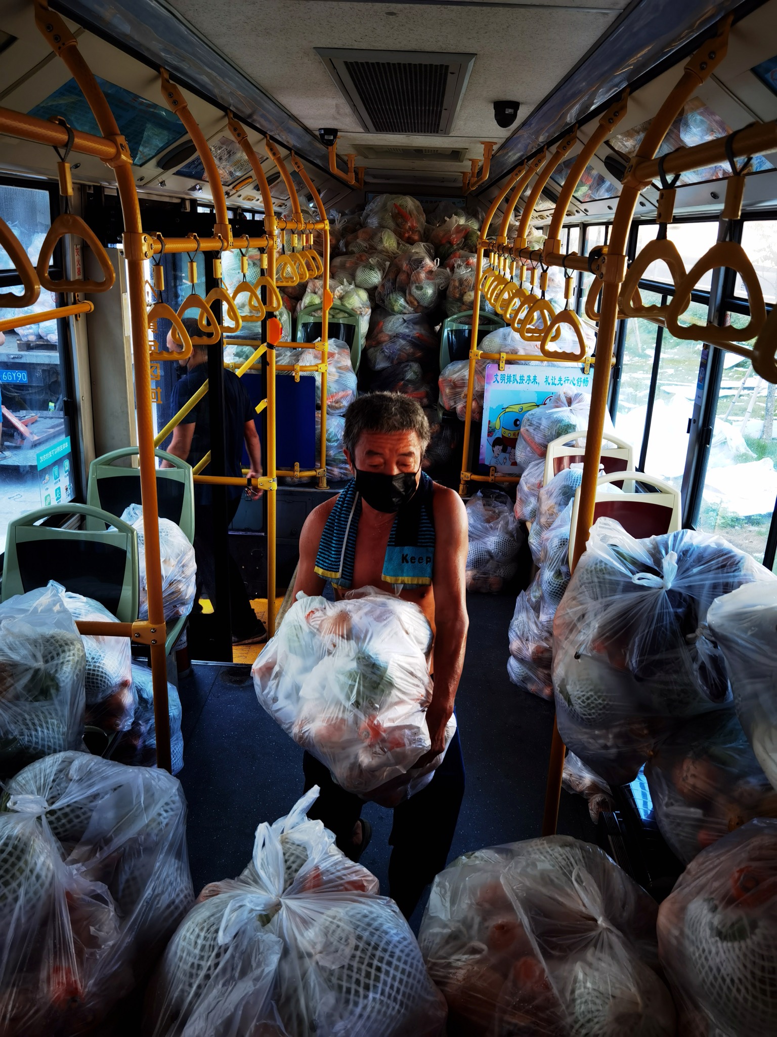 21日上午,在閩南農副產品物流中心。近百名工人和志願者正在搬運蔬菜,雖然汗流浹背,但大家熱情不減、速度不減。