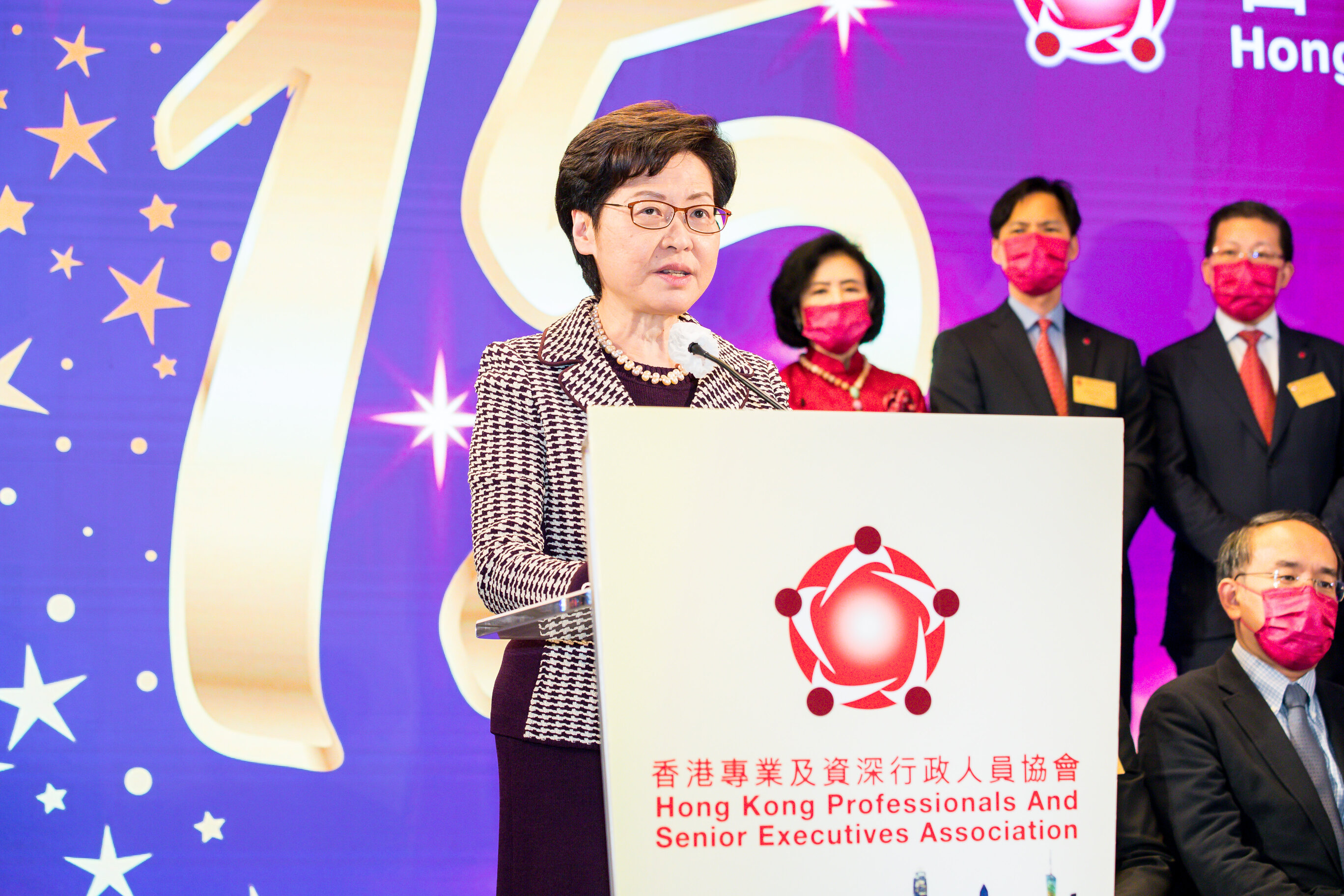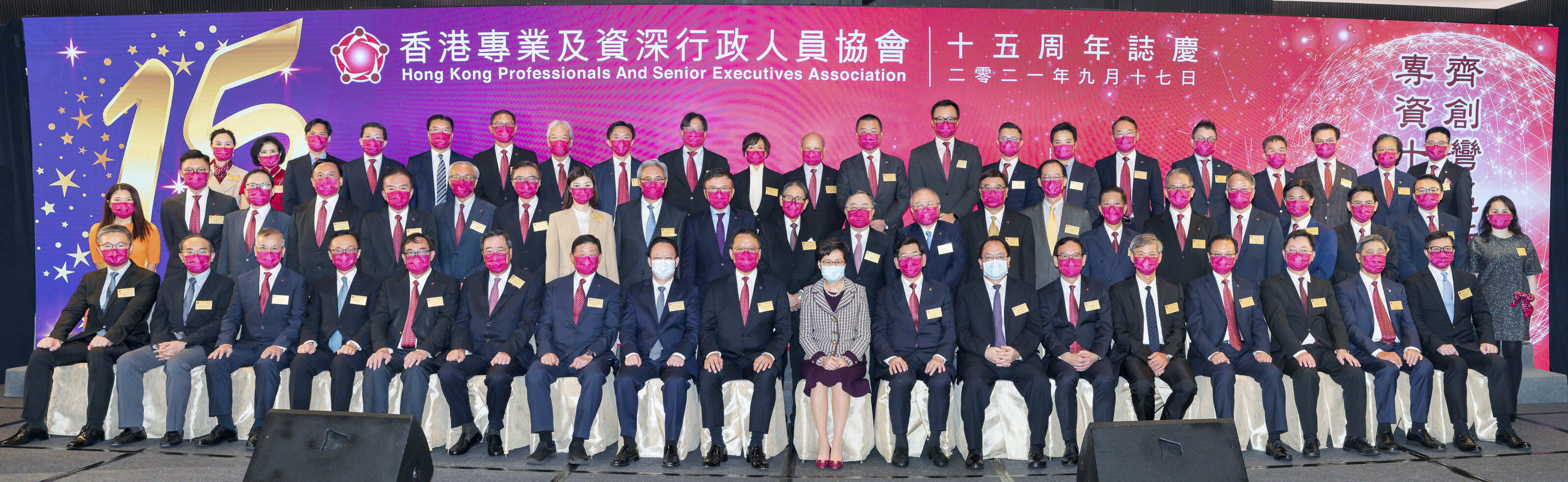 香港專業及資深行政人員協會日前舉行「十五周年誌慶典禮」,由行政長官林鄭月娥、中聯辦副主任譚鐵牛、外交部駐港副特派員潘雲東蒞臨擔任主禮嘉賓,與各位嘉賓、專資會榮譽顧問、理事會成員及會員逾270人一同慶祝,祝賀專資會穩步邁向更豐盛的未來。其他出席嘉賓包括立法會主席梁君彥、勞工及福利局局長羅致光、公務員事務局局長聶德權、創新及科技局局長薛永恒、財經事務及庫務局局長許正宇、保安局局長鄧炳強、警務處處長蕭澤頤等,另有多位工商專業團體的會長、主席,以及該會多名榮譽顧問,包括行政會議成員前任非官守議員梁智鴻、審計署前署長孫德基、香港都會大學前校長黃玉山等。