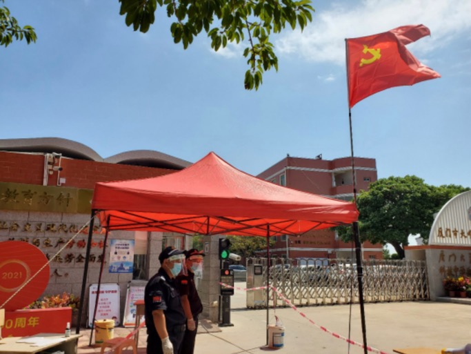 行至大嶝中學門口,有序進場的村民、值守的人員、飄揚的黨旗,一切似乎和普通的核酸監測點沒有什麼不同,但在這裏,我們看到了這場「戰疫」背後的感動。