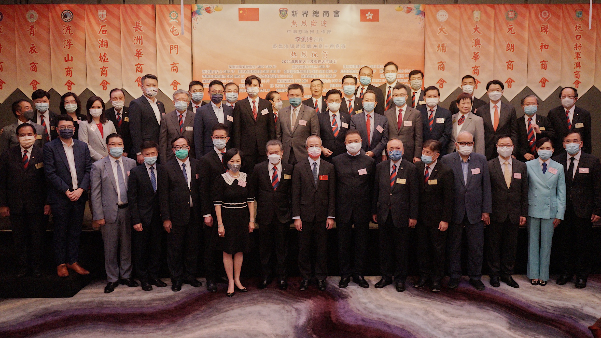 新界總商會日前假美麗華酒店舉辦「董事會會議暨國慶晚宴」,中聯辦新界工作部部長李薊貽應邀主講。他指出,相比兩年前,香港社會已有極大改善,在香港國安法及完善選舉制度後,「一國兩制」已重回正軌,是時候專注發展經濟。該會會長張德熙、主席王振聲、事務委員會主席彭志宏、會務委員會主席周駿達等首長出席,當晚還祝賀獲得港府授勳的該會會員們,百人參與、氣氛熱烈。