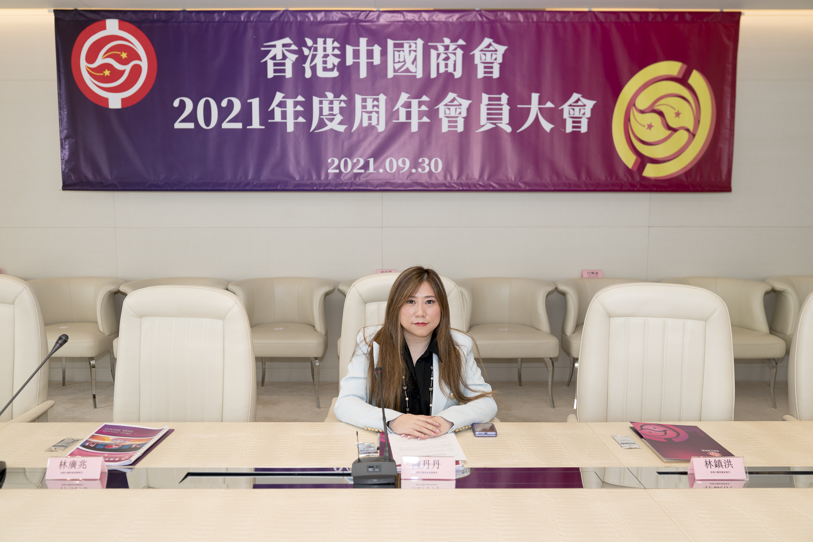 由該會主席陳經緯授權,本次周年會員大會由陳丹丹擔任會議主席,她代表陳經緯主席對大家百忙中出席是次會員大會並關心商會發展表示感謝。她表示,2020年度在各位會長及會員的大力支持下,香港中國商會在服務會員企業業務拓展、開拓內地企業跨境投融資及扶持港澳台青年在內地創新發展「紫荊谷」項目、關愛弱勢社群的「陽光天使義工團」慈善項目、參與粵港澳大灣區及「一帶一路」建設,反黑暴、反港獨及抗疫救災等方面,做了大量的工作,成績有目共睹,受到相關部門和合作機構的肯定。