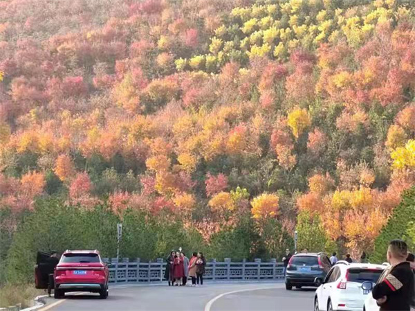 天龍山公路兩側層林盡染,楓葉如霞似火