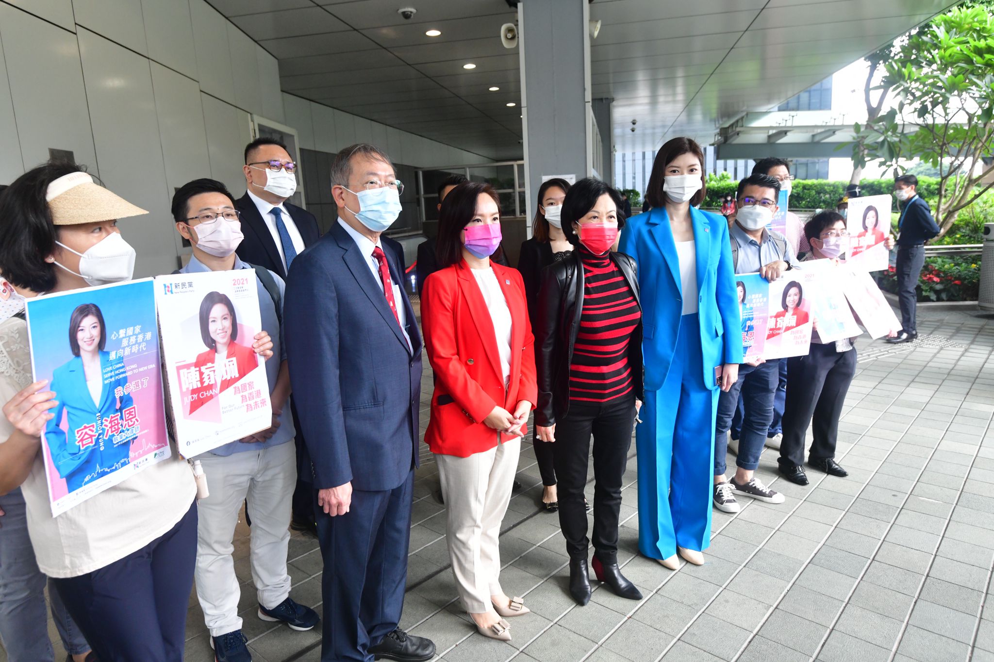 今早,葉劉淑儀亦陪同新民黨現任立法會議員容海恩及前南區區議員陳家珮到政府總部報名,參加立法會選委會界別選舉。