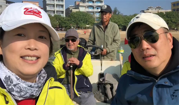 潘文石教授和女兒潘岳、女婿趙一,一家兩代三口人出海觀察白海豚棲息海域途中