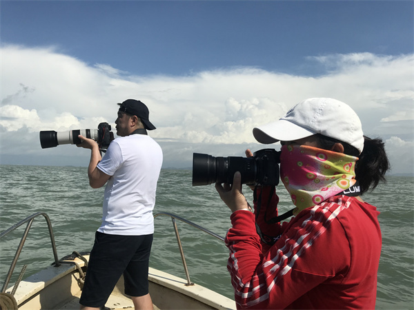 潘岳、趙一在三娘灣海域觀察白海豚