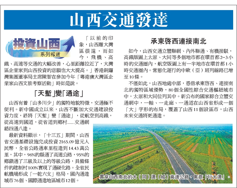 不僅如此,山西地處中部,憑藉承東啟西、連接南北的獨特區域優勢,80個全國性綜合交通樞紐城市中,太原和大同位列其中。新公布的國家綜合立體交通網中,一軸、一走廊、一通道在山西省形成一個「大」字形的布局,覆蓋了山西11個設區市,山西未來交通將更通達。(王利萍)