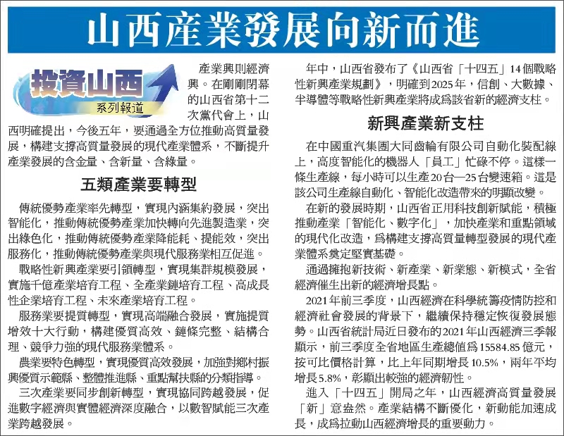 進入「十四五」開局之年,山西經濟高質量發展「新」意盎然。產業結構不斷優化,新動能加速成長,成為拉動山西經濟增長的重要動力。(王利萍)
