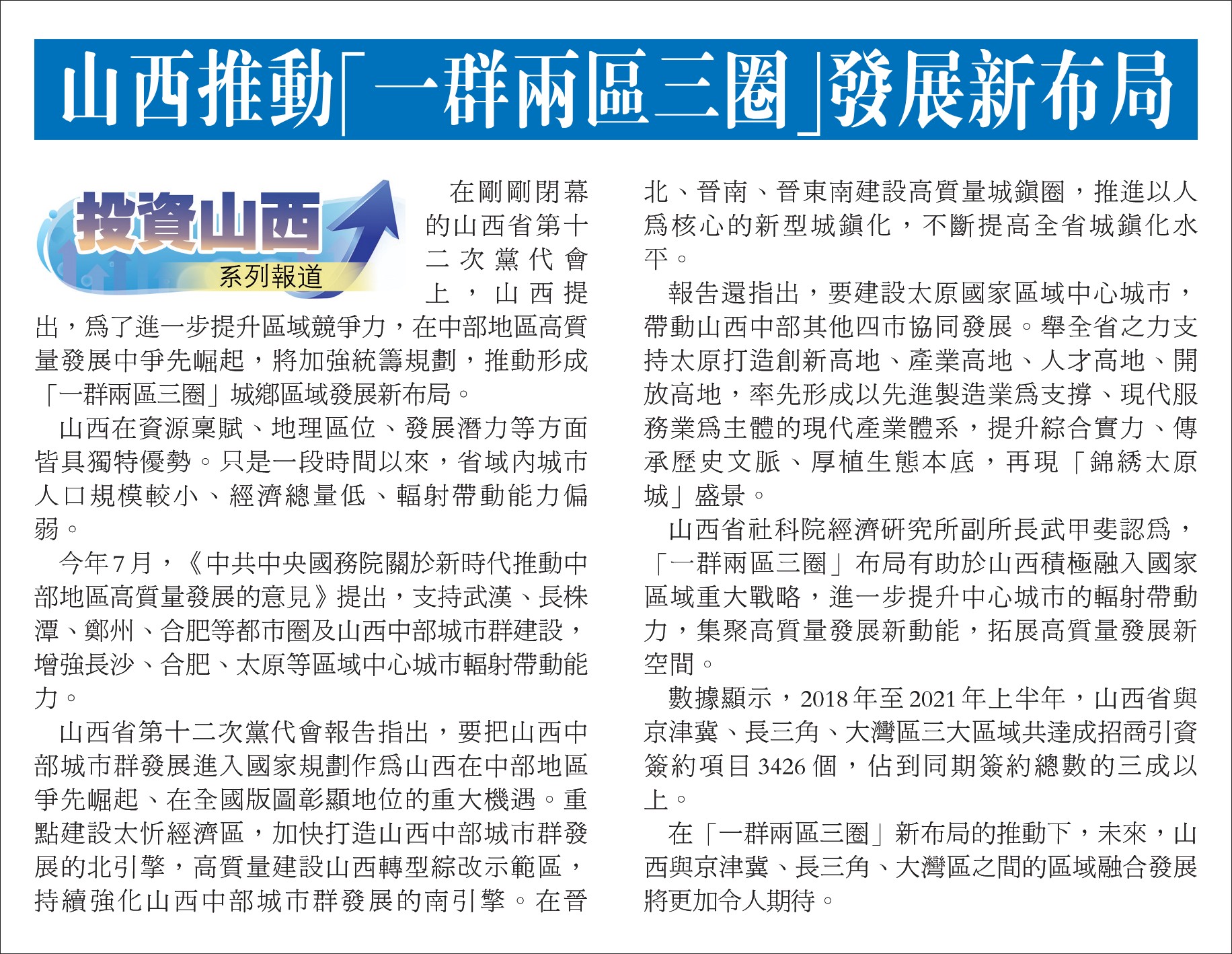 山西省社科院經濟研究所副所長武甲斐認為,「一群兩區三圈」布局有助於山西積極融入國家區域重大戰略,進一步提升中心城市的輻射帶動力,集聚高質量發展新動能,拓展高質量發展新空間。