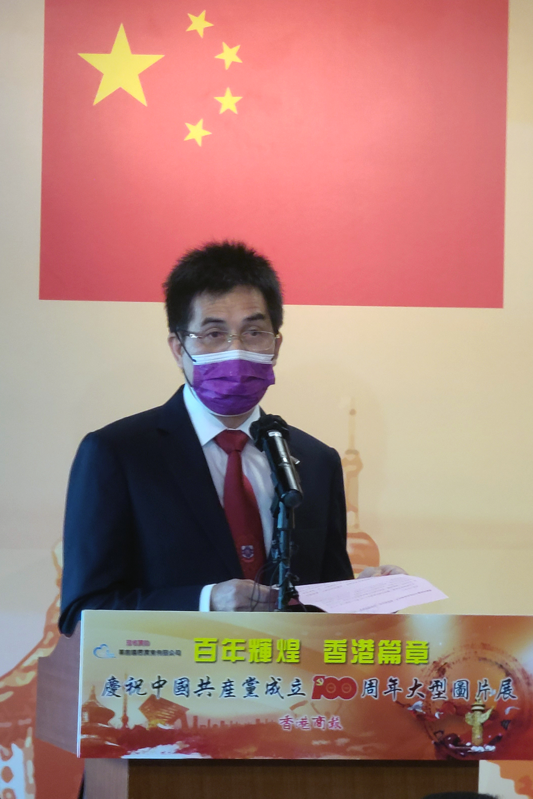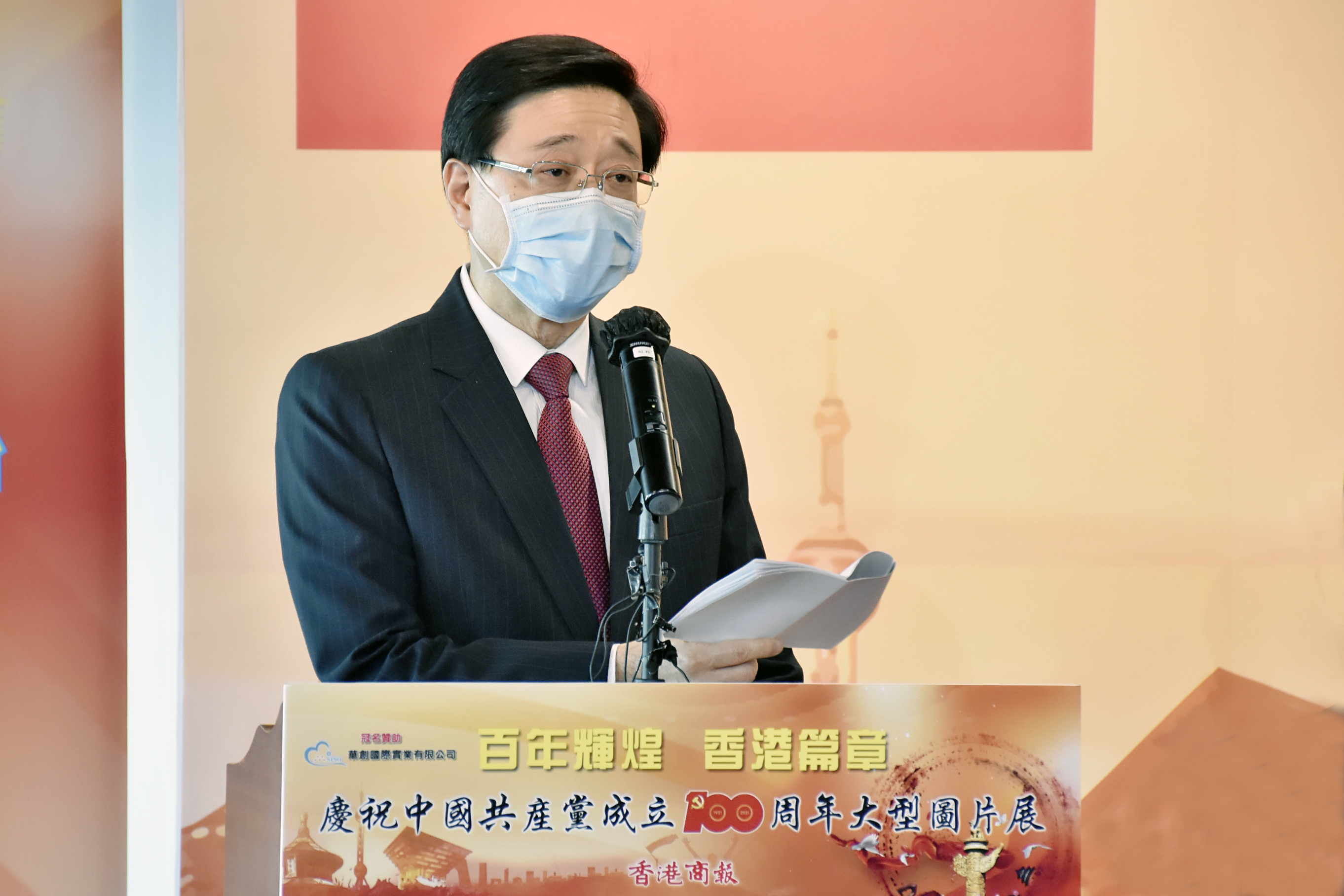 李家超致辭表示,很高興出席由《香港商報》舉辦的「百年輝煌 香港篇章 慶祝中國共產黨成立100周年大型圖片展」開幕典禮,大家一起回顧中華民族偉大復興的重要歷程。祖國在經濟、科技、基建、探索太空等領域的成就,作為中國人深感鼓舞。今次展覽免費參觀,讓廣大市民可以深入認識中華民族從站起來、富起來到強起來的偉大飛躍,實現中華民族偉大復興的中國夢,更加深深體會到香港與祖國血脈相連,強化對國家的認同感和民族的自豪感,發揮愛國愛港的力量。李家超指出,國家是香港的最強大後盾,中央果斷出手,施展了「組合拳」,制定《香港國安法》及完善了香港選舉制度,落實「愛國者治港」原則,讓「一國兩制」的實踐行穩致遠。