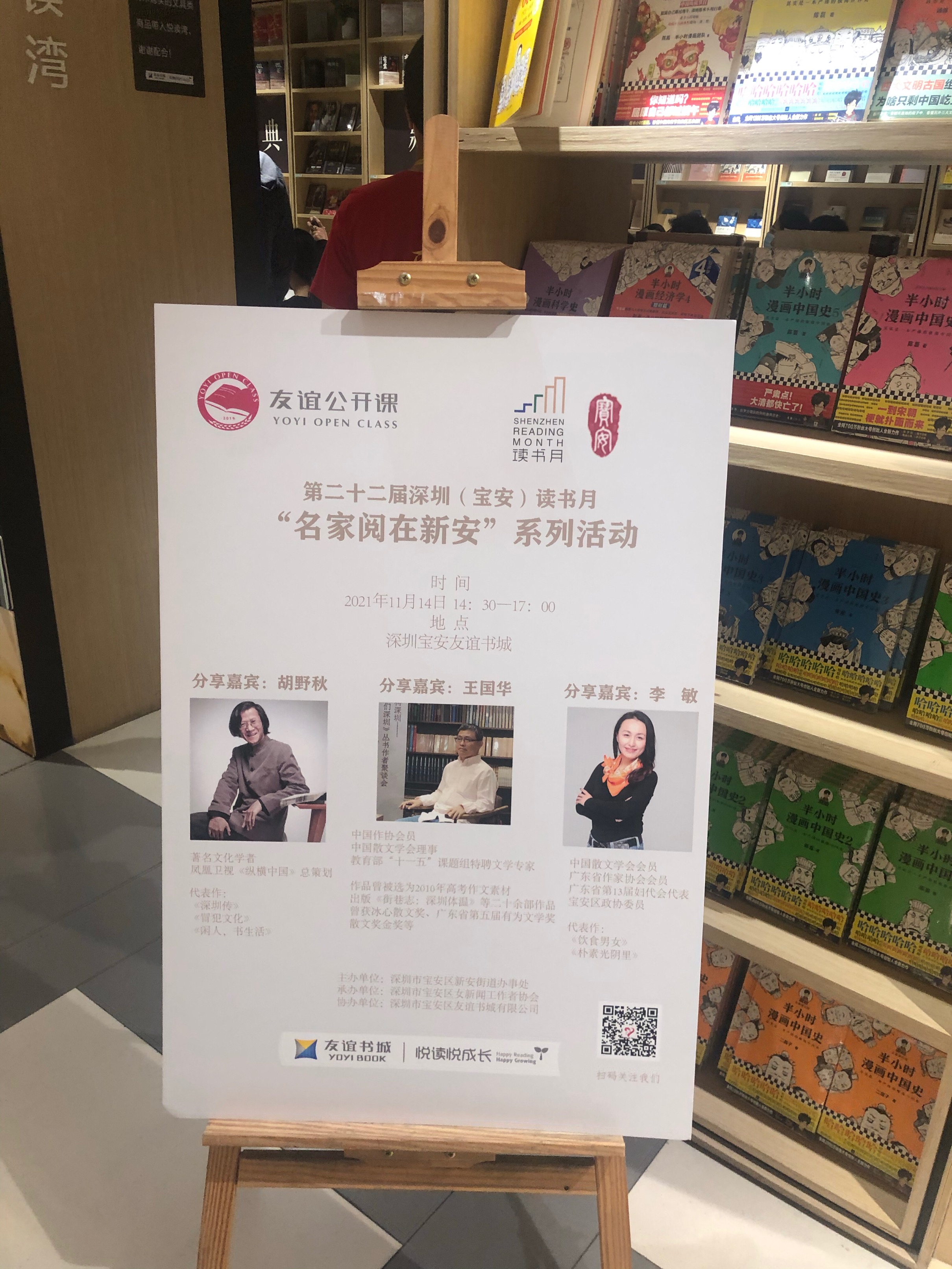 11月14日,深圳(寶安)讀書月「名家閱在新安」活動在友誼書城(寶安店)順利啟動,本次活動由深圳市寶安區新安街道辦事處主辦,深圳市寶安區女新聞工作者協會承辦,深圳市寶安區友誼書城有限公司協辦。活動邀請了著名文化學者、鳳凰衛視《縱橫中國》總策劃胡野秋,廣東省作家協會會員、《街巷志:深圳體溫》作者王國華,中國散文學會會員、廣東省作家協會會員、《飲食男女》、《樸素光陰里》作者李敏等名家做客活動現場,與現場近百名觀眾共度閱讀時光。