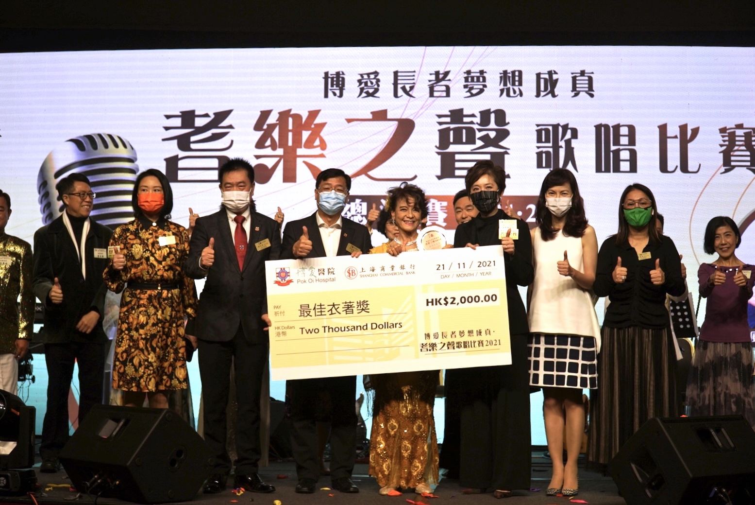 李柏成博士與上海商業銀行執行副總裁兼人力資源處總監馮楚卿(右三)及陳文綺慧(右二)頒發「最佳衣着獎」予參賽者黃正女(70歲),並由博愛醫院董事局副主席暨籌募及推廣委員會主席廖齡儀(左一)、博愛醫院董事局副主席陳首銘(左二)、韓嘉軒(右一)陪同頒發。