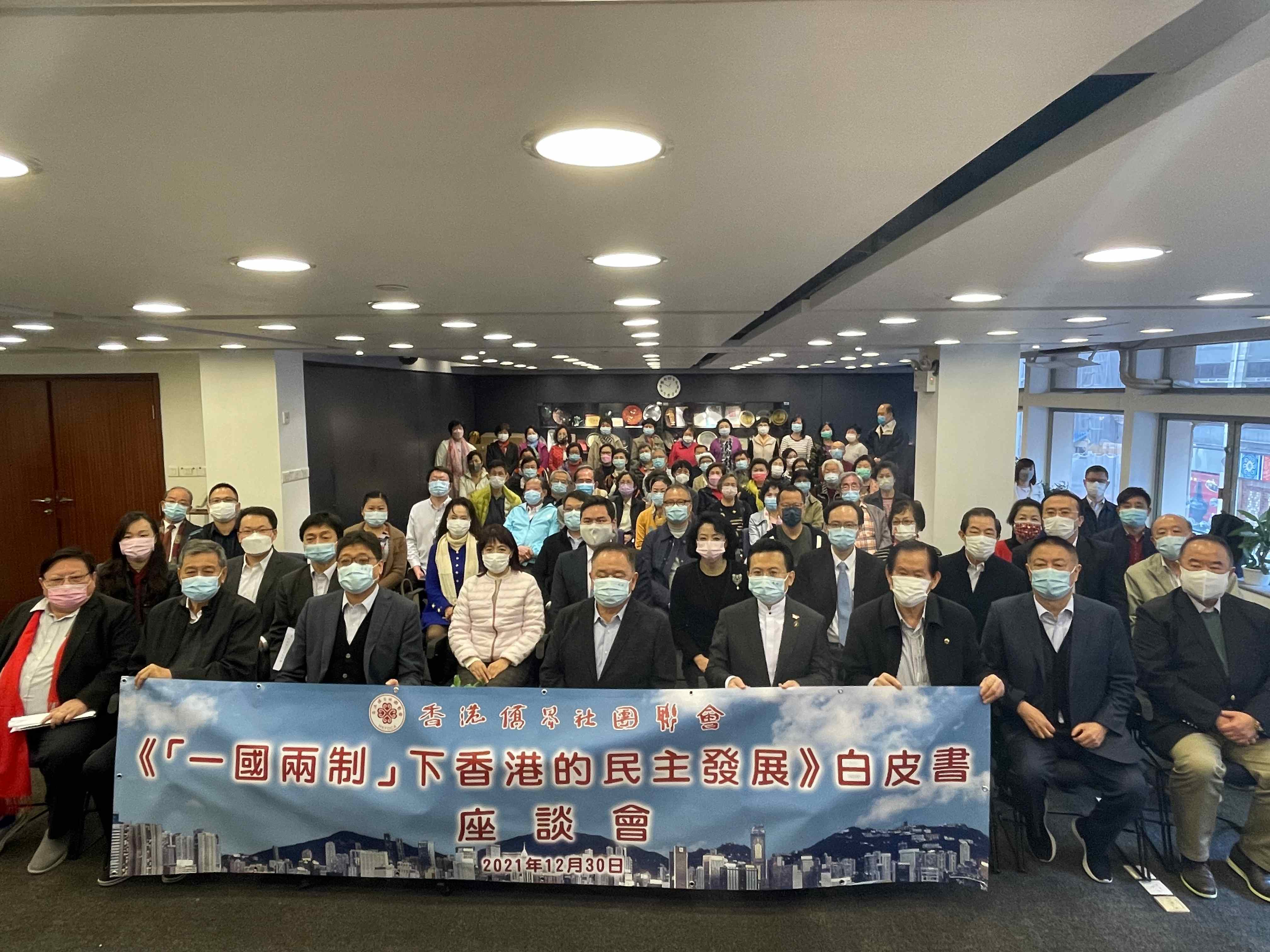 香港僑界社團聯會於香港福建商會會所舉行《「一國兩制」下香港的民主發展》白皮書座談會。