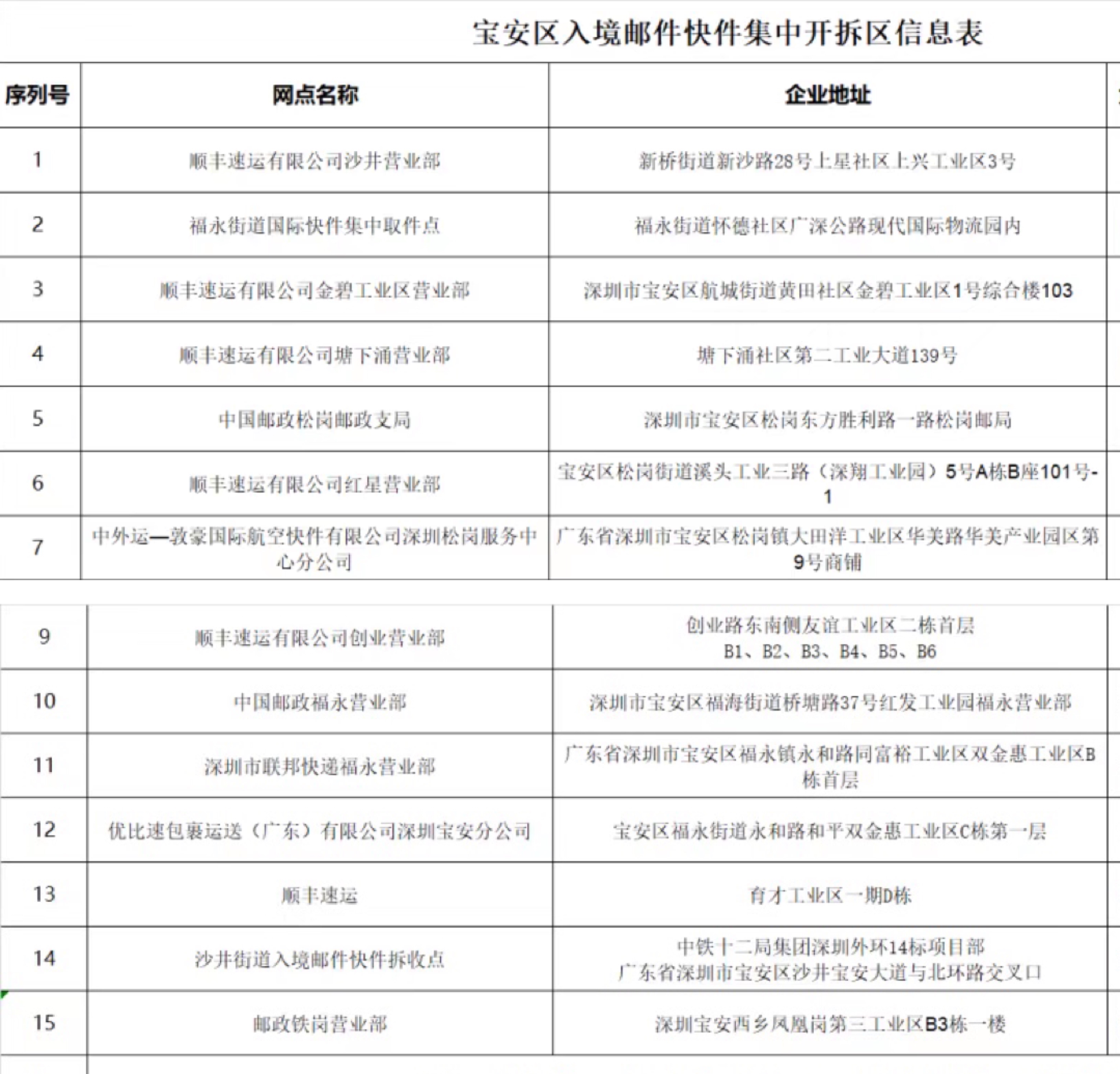2月13日晚,《深圳市寶安區新型冠狀病毒肺炎疫情防控指揮部辦公室通告〔2022〕10號》發布,通告稱,為貫徹落實「外防輸入」疫情防控策略,做好入境郵件快件疫情防控工作,經研究決定,自2月14日零時起,深圳寶安區轄區郵政快遞企業停止入境郵件快件上門派送業務,全區設置15個集中拆件區,請收件人根據郵政快遞企業的通知,前往指定點位取件。