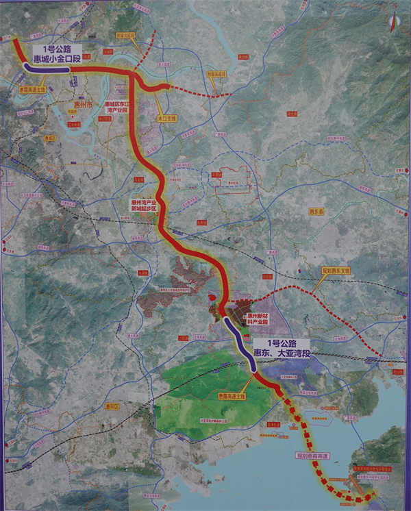 據介紹,惠州市「豐」字交通主框架是列入廣東交通強國建設試點的重大項目之一,此次全面啟動建設的惠州市1號公路(惠霞高速)由主線和水口支線兩部分組成,全長約69.54公里,總投資估算246.43億元。規劃主線雙向十二車道,設計車速為100公里每小時。其中主線起於博羅縣羅陽街道,與廣惠高速相接,由北向南分別途經博羅縣、惠城區、惠陽區、惠東縣、大亞灣開發區5個縣(區)9個鎮(街),終點與惠深沿海高速銜接,長約64.29公里。