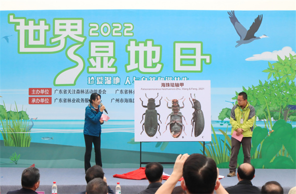 2月18日,第26個世界濕地日廣東省宣傳活動在廣州海珠國家濕地公園舉行,今年濕地日的主題是「珍愛濕地——人與自然和諧共生」。本次活動最大的亮點莫過於昆蟲新物種——「海珠琺軸甲」的亮相。2021年底,海珠濕地自然學校自然導師朱江在國際學術期刊Biodiversity Data Jounral上發表一新物種,系該物種在世界上的首次發現,將其命名為「海珠琺軸甲」(Falsonnanocerus haizhuensis)。