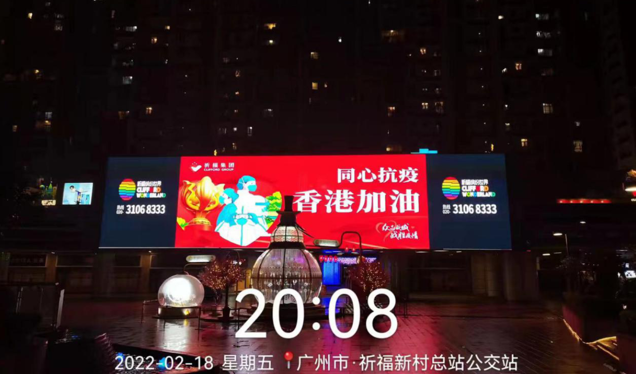 值得一提的是,除了在抗疫藥品和資金方面的援助外,祈福集團還通過各種管道和平台發聲為香港和香港市民打氣加油。如在祈福新邨多個大型 LED屏和祈福集團中心的玻璃外牆投放“香港加油”的主題聲援海報和字幕,為香港加油打氣;祈福集團還連同國內香港知名人士拍攝MV聲援香港。