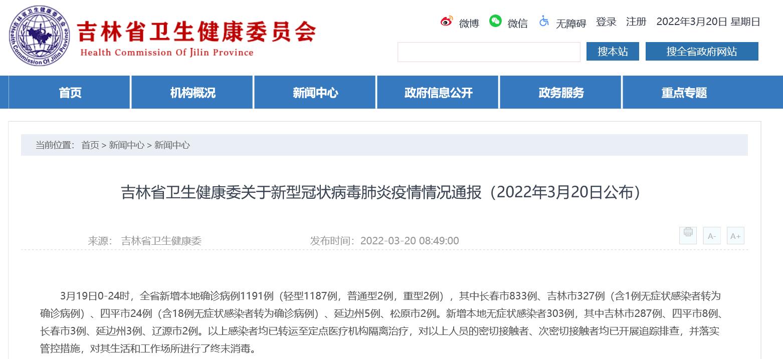 3月19日0-24時,全省新增本地確診病例1191例(輕型1187例,普通型2例,重型2例),其中長春市833例、吉林市327例(含1例無症狀感染者轉為確診病例)、四平市24例(含18例無症狀感染者轉為確診病例)、延邊州5例、松原市2例。新增本地無症狀感染者303例,其中吉林市287例、四平市8例、長春市3例、延邊州3例、遼源市2例。以上感染者均已轉運至定點醫療機構隔離治療,對以上人員的密切接觸者、次密切接觸者均已開展追蹤排查,並落實管控措施,對其生活和工作場所進行了終末消毒。(王丹 吉林省衛生健康委)