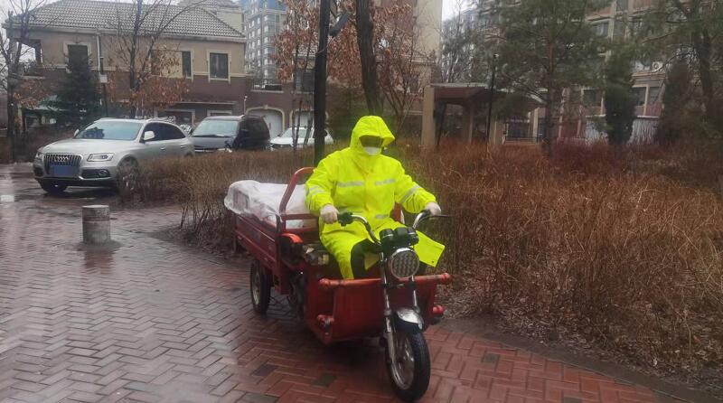 物業員工冒雨為小區業主送生活物資(3月28日開始,全園區管控,物業為2077戶配送物資。)