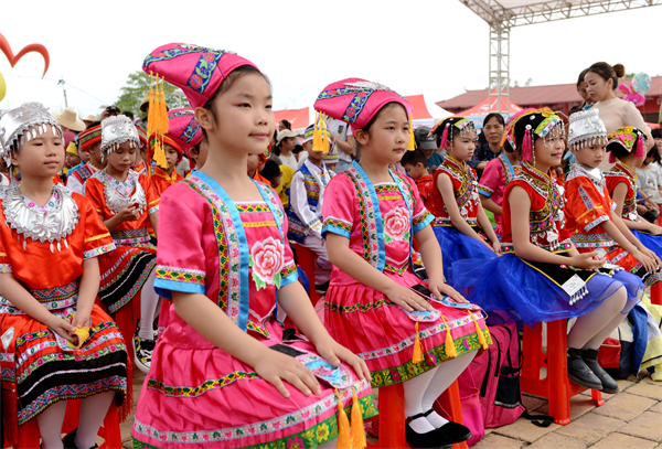身穿少數民族服裝的學生在觀看演出