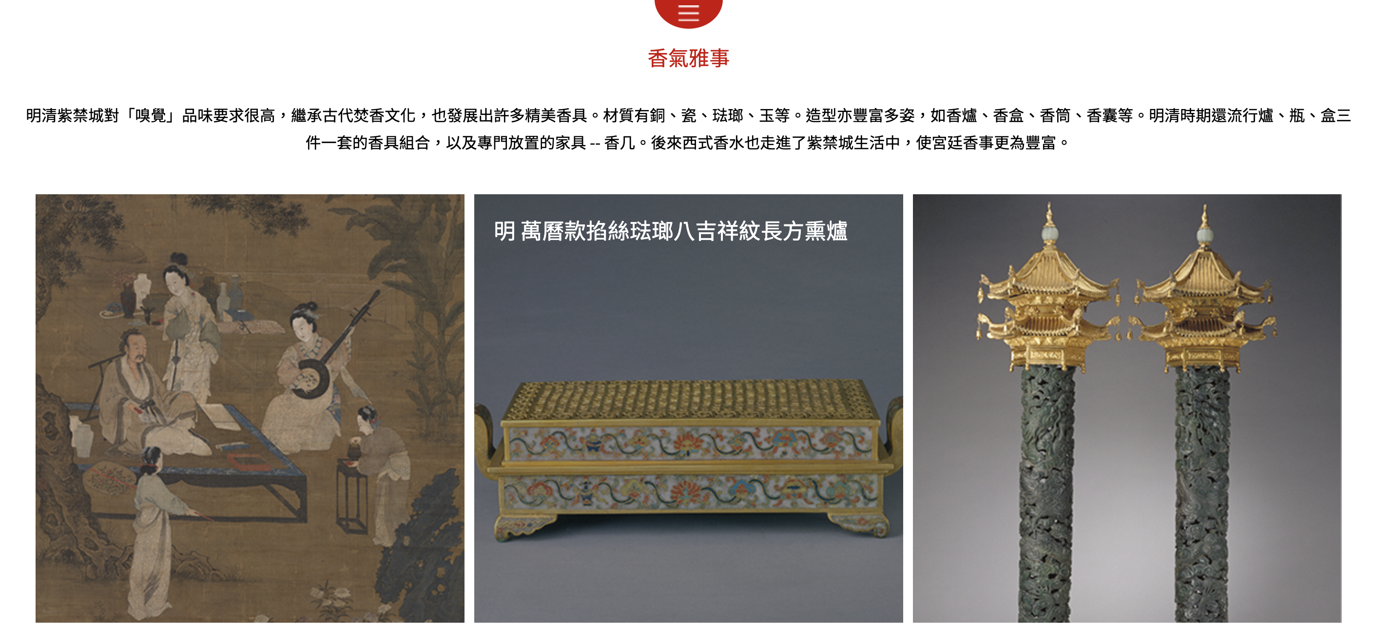 現代人會使用香氛讓家居氣味更怡人,其實明清紫禁城對「嗅覺」品味要求也很高,展覽展示當時發展出的精美香具。