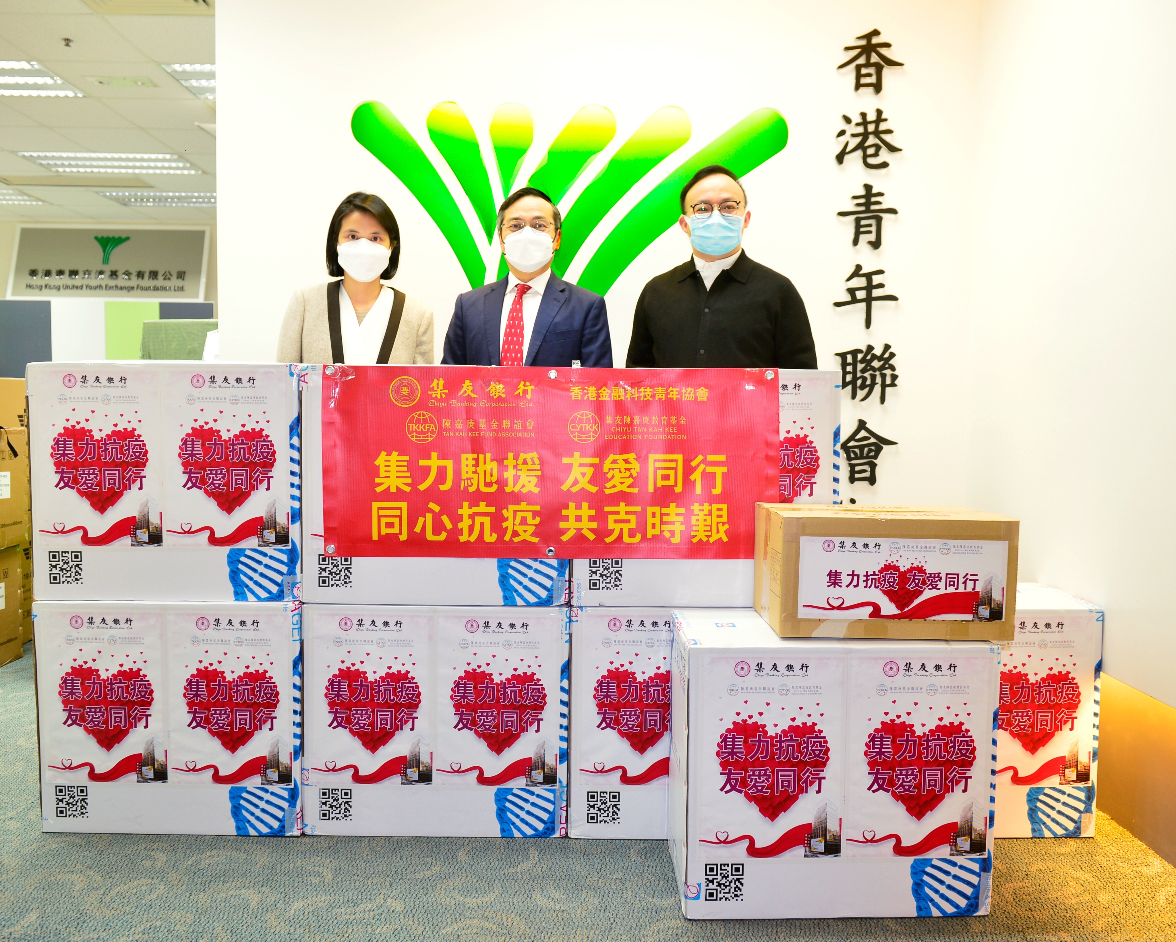 集友銀行副總裁、集友陳嘉庚教育基金副董事長、陳嘉庚基金聯誼會副秘書長、香港金融科技青年協會代表陳耀輝(中)出席「集力馳援 友愛同行 同心抗疫 共克時艱」捐贈儀式,香港青年聯會副主席柯家洋(右)及副主席林顥伊(左)代表接受捐贈。