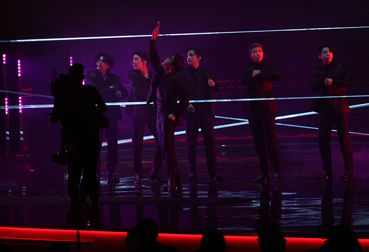 雖然無緣獎項,但BTS帶來的《Butter》舞台就成功炒熱了全場氣氛。7子以全黑西裝型格登場,表演相當游刃有餘,引得全場觀眾和歌手都起立並隨着音樂拍手搖擺,非常投入BTS的舞台。