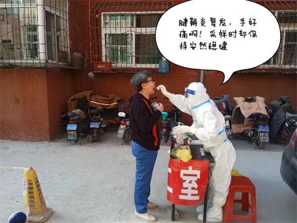 負責採樣的是山西省中西醫結合醫院的兩名醫護人員,其中一個小張患有腱鞘炎,疼痛難忍,但採樣的時候卻一絲不苟,沒有一點退縮。