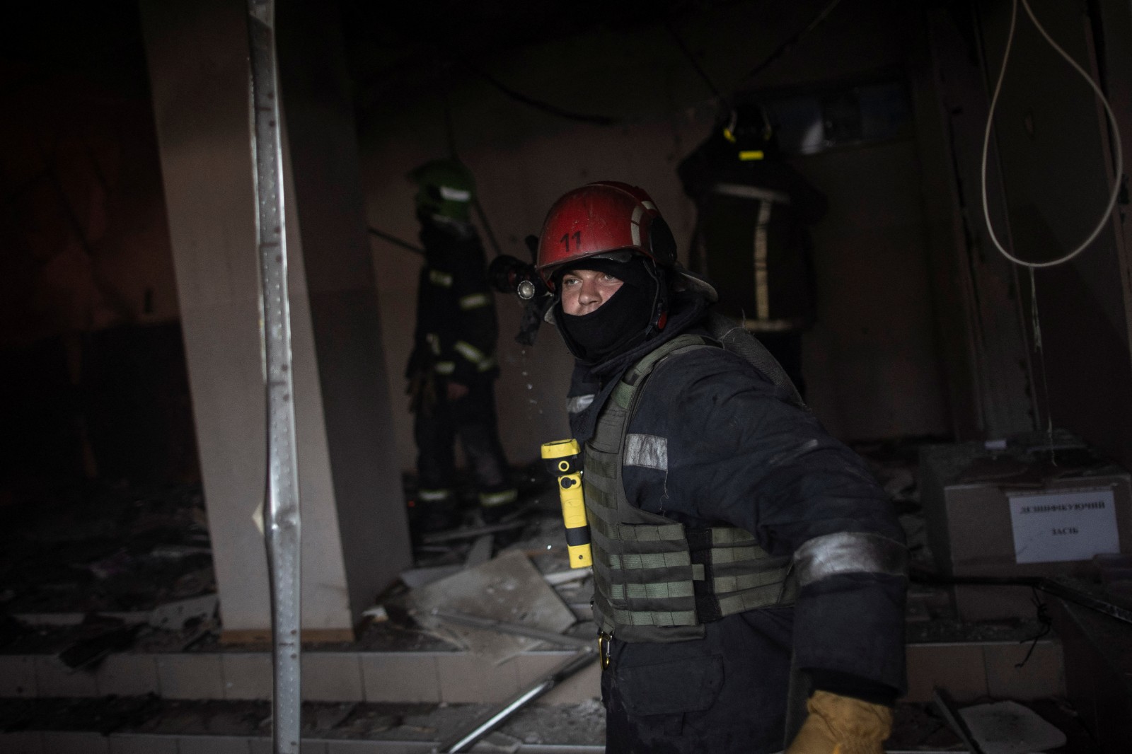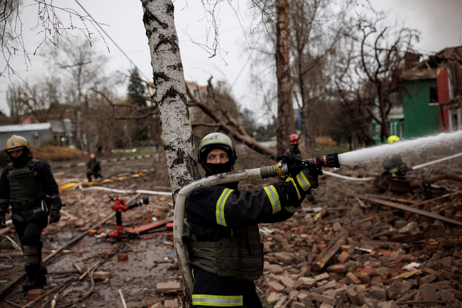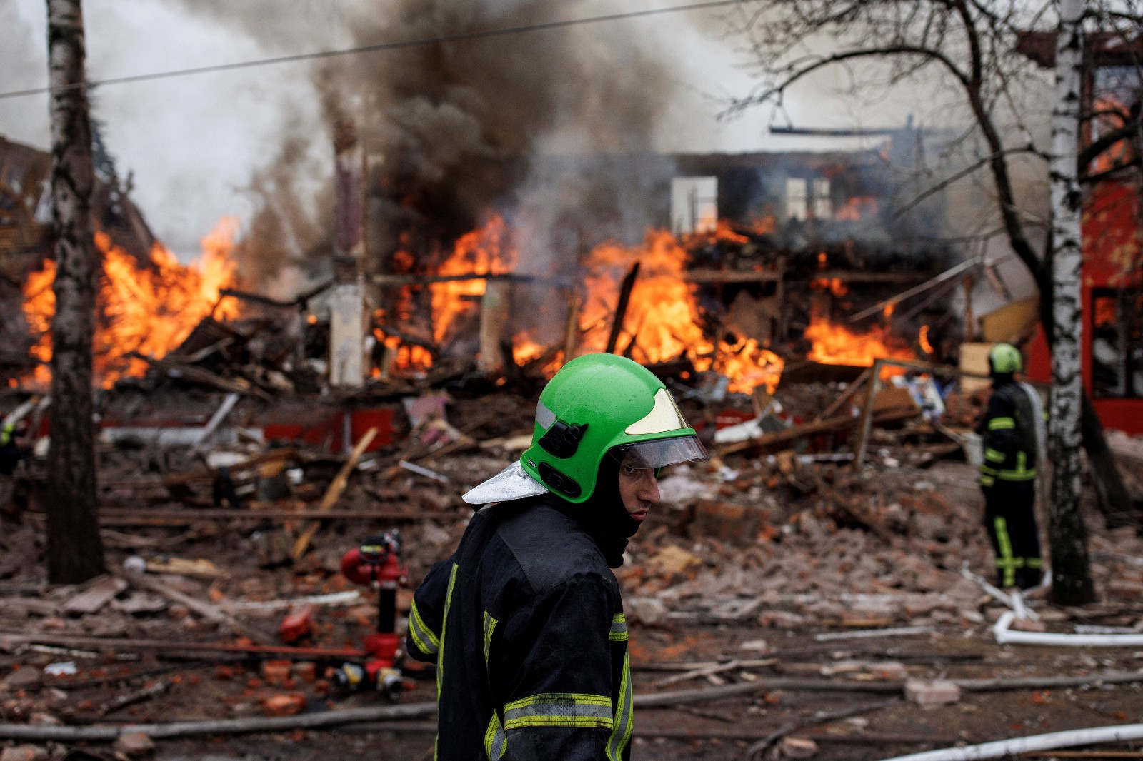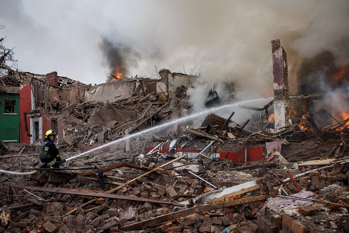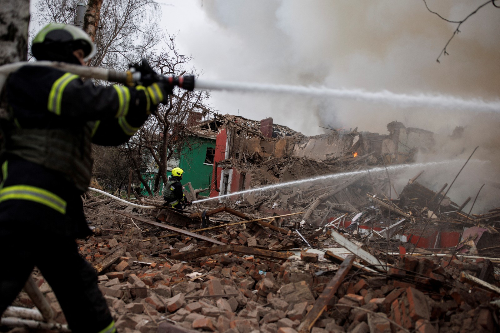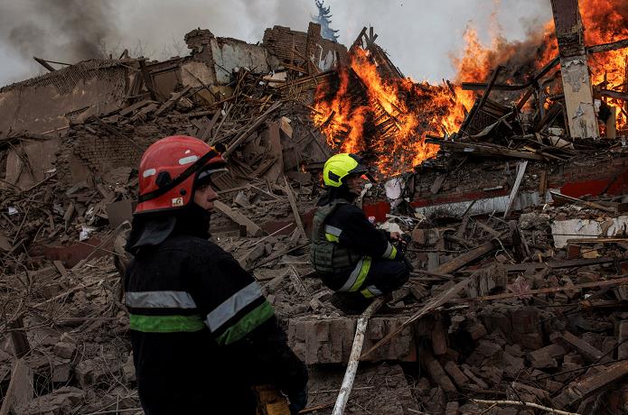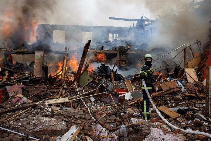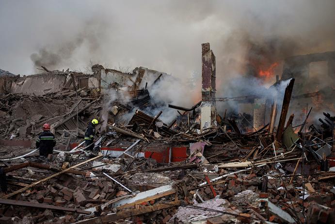 據路透社報道,俄軍繼續在烏克蘭進行軍事行動,當地時間12日,烏克蘭哈爾科夫國際機場(Kharkiv International Airport)附近居民區一棟建築物遭俄軍炮擊後引發大火,當地消防人員趕至救火。(圖源:路透社)