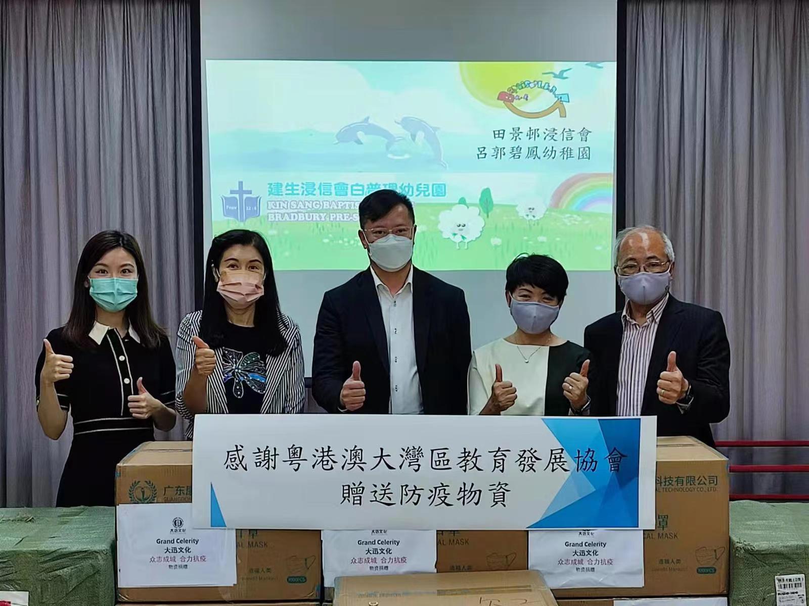 香港第五波新冠肺炎疫情仍未全面有效控制,市民健康受到嚴重威脅的嚴峻局面。粵港澳大灣區教育發展協會捐送超過十萬元防疫物資予田景邨浸信會呂郭碧鳳幼稚園及建生浸信會白普理幼兒園。希望今次捐贈的防疫物資能幫助到兩間幼稚園,迎接本月21日開學需要。