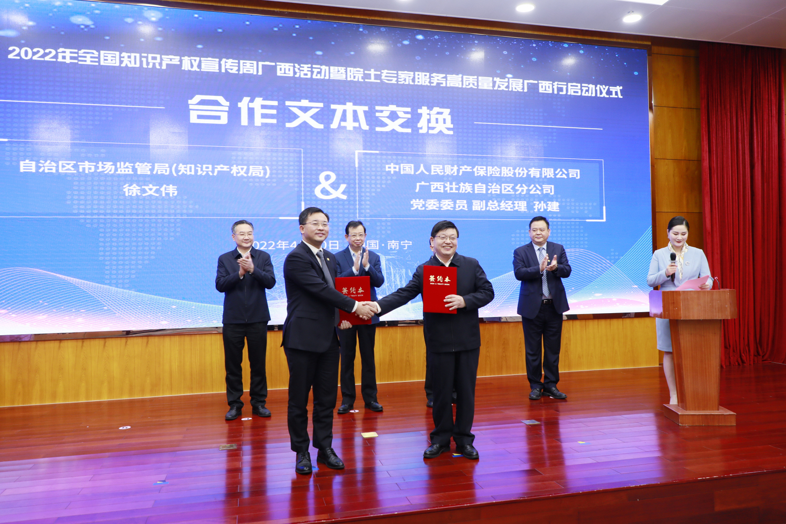 廣西壯族自治區市場監管局(知識產權局)與中國人民財產保險股份有限公司廣西壯族自治區分公司交換合作文本。 楊彪攝