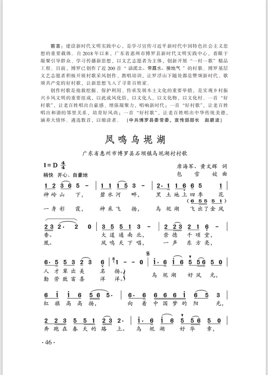 日前,記者從博羅縣委宣傳部了解到,由博羅縣文藝志願者合力創作的《鳳鳴烏坭湖》等9首優秀村歌,近期發表於國家級音樂類刊物《歌曲》雜誌,成為博羅縣新時代文明實踐志願服務和鄉風文明建設的又一突破。《歌曲》雜誌有關負責人指出,此次博羅村歌專欄的發布,為全國村歌創作做出了重要探索。