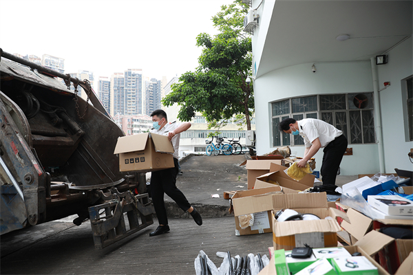 海關關員將侵權的貨物運往固體廢物處置機構。(俞波攝)