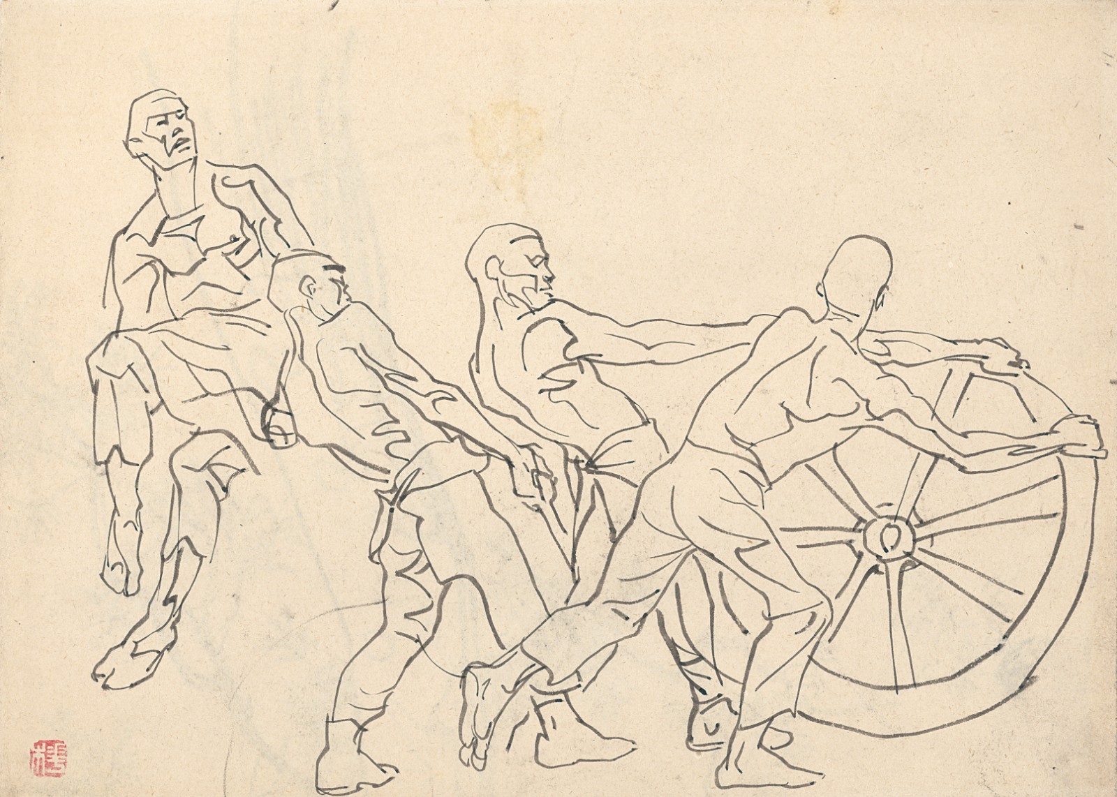 從《臨摹速寫作品集》中可以看出李樺對生活的觀察細緻入微,對於人物的動作神態把握十分精準,如畫中多次出現搬運東西的人,動作各不相同:有的雙手托住箱子扛在肩上,身體向一側傾斜;有的身體直立,單手扶著肩上的袋子;還有的人抓住袋子舉起來,用肩背撐住重物,邁開雙腿保持平衡。這些動作細節可以傳遞出許多資訊,如貨物的重量、力量的差異、各人的行事風格等等。