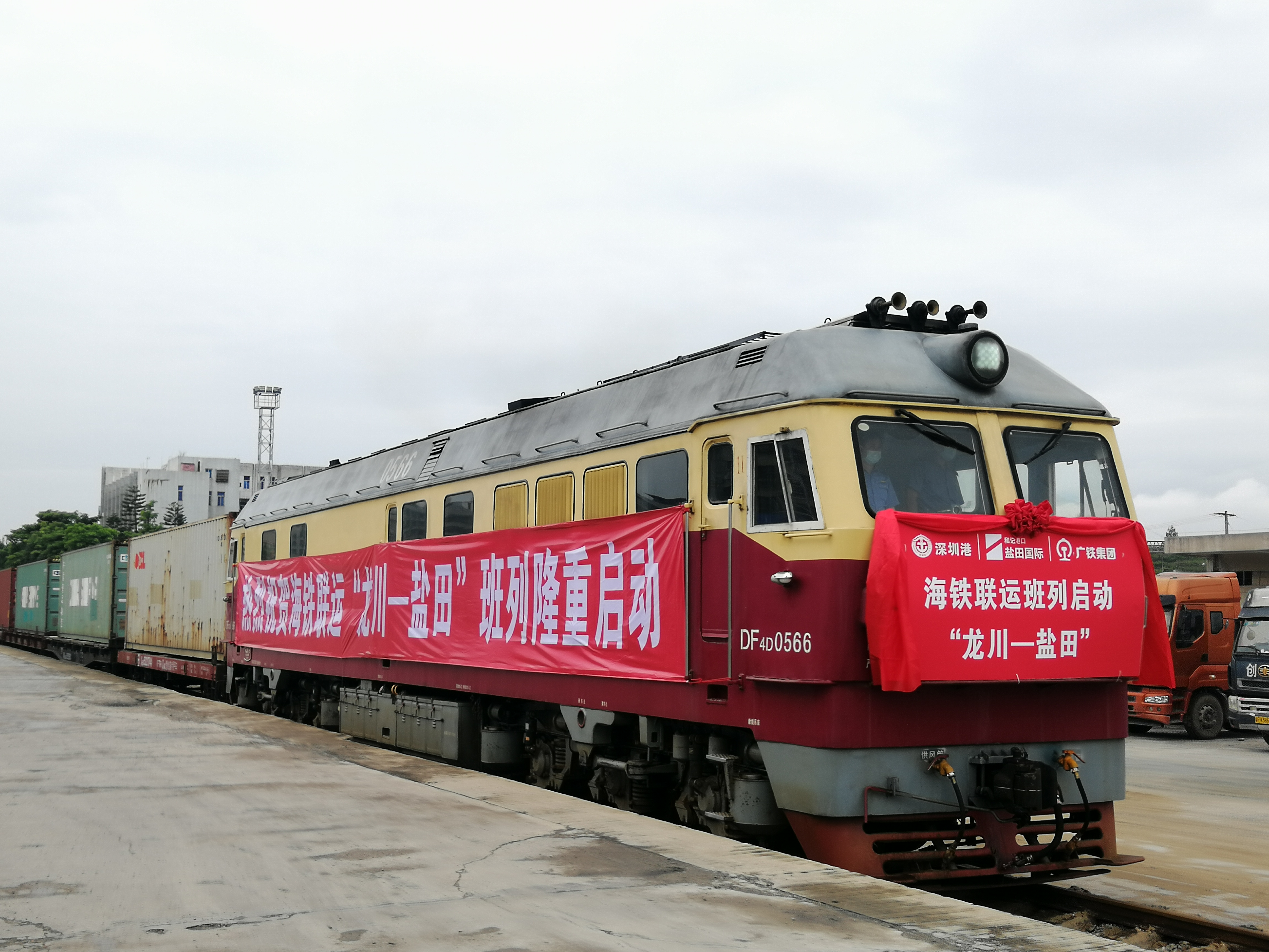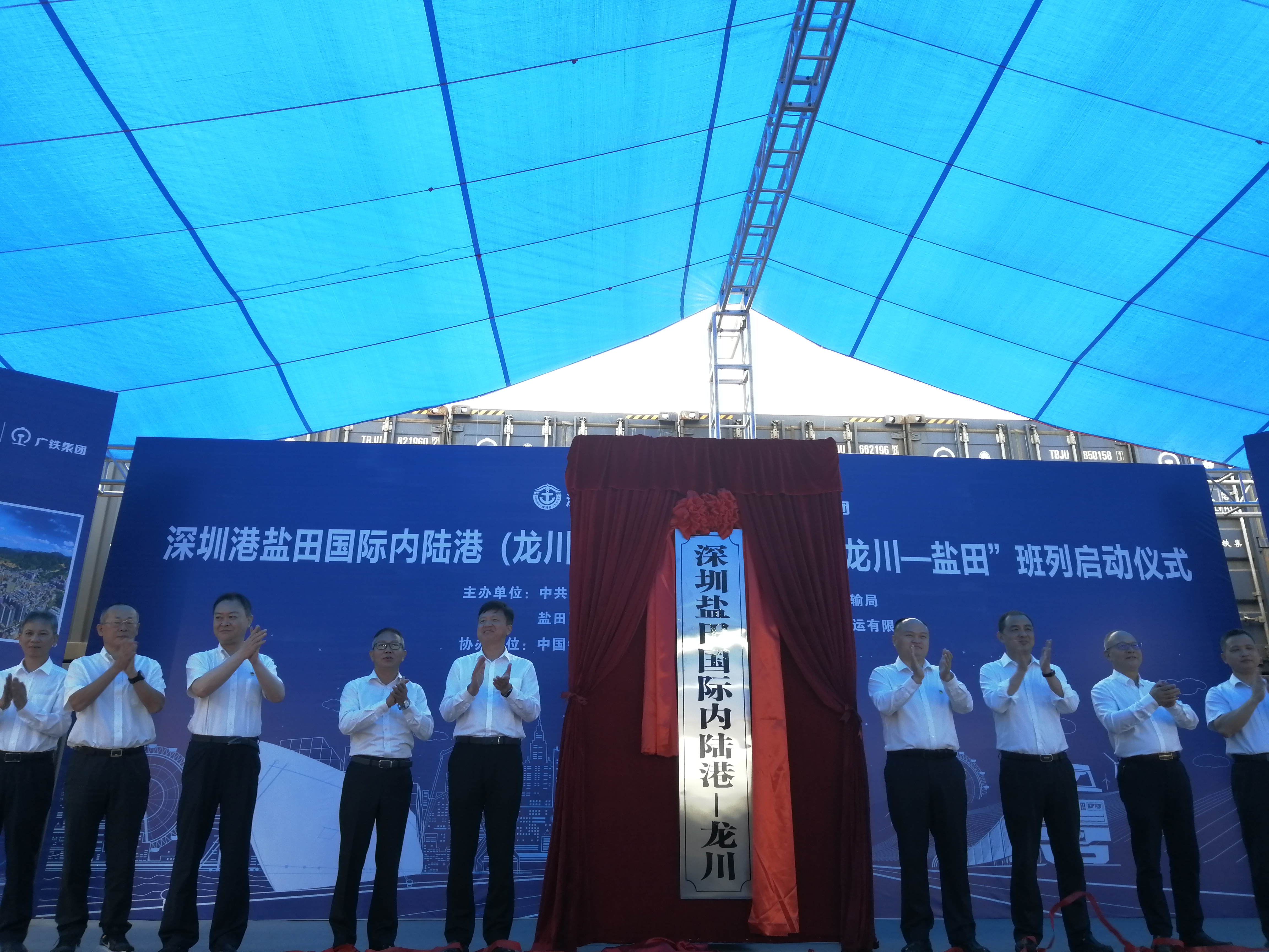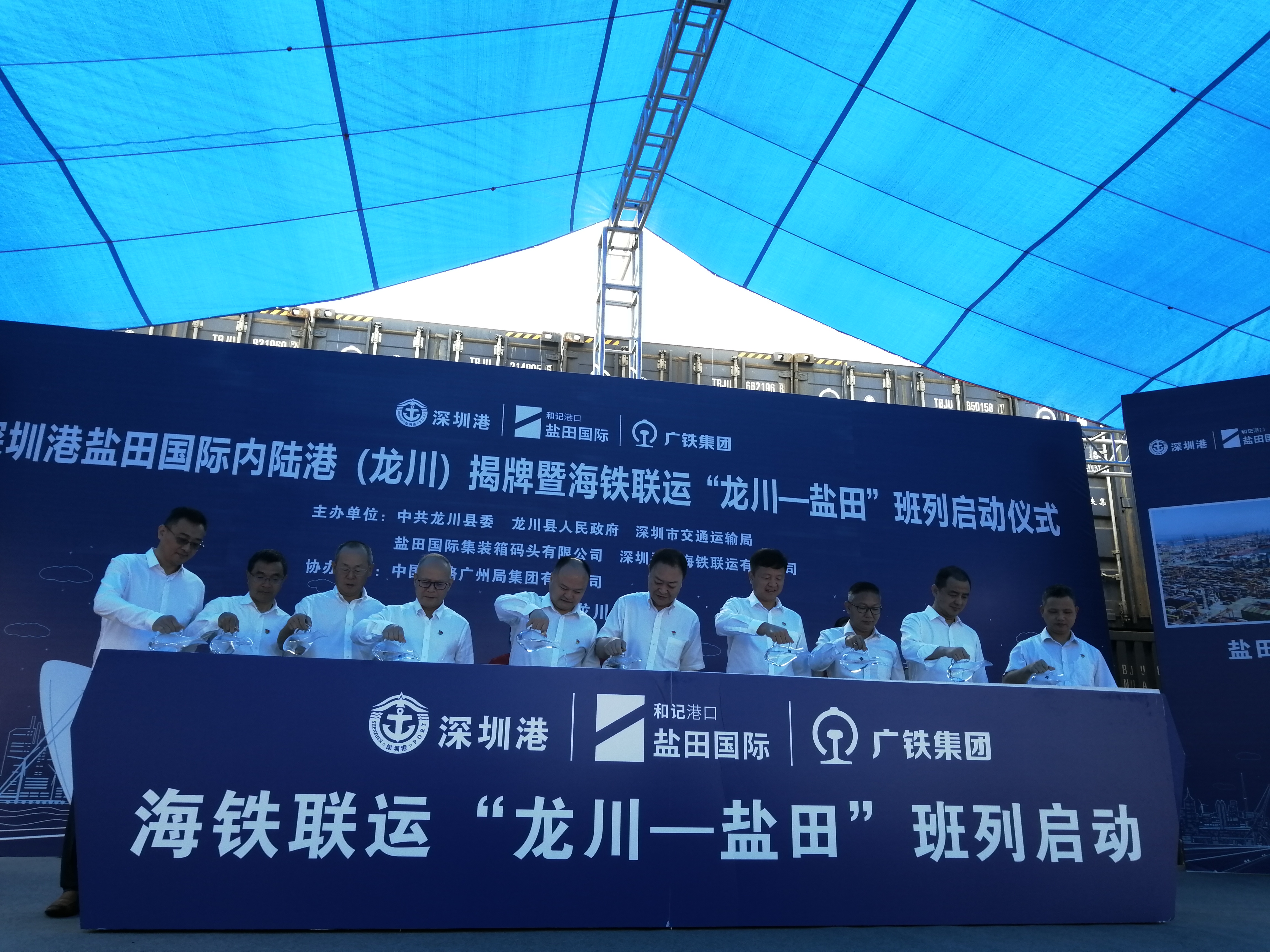 儀式現場,深圳市交通運輸局副局長蔡鑫、龍川縣委書記、縣長劉力,鹽田國際集裝箱碼頭有限公司、深圳平鹽海鐵聯運公司、廣州貨運中心等有關負責人共同為深圳鹽田國際內陸港—龍川揭牌。隨後,河源市委常委、深圳對口幫扶河源指揮部總指揮劉渤,原深圳市交通委員會副主任溫文華等共同啟動海鐵聯運「龍川—鹽田」班列首發儀式。