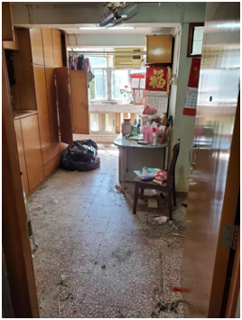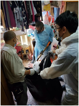 說起抗疫工作中的難忘事。葛兆源說到,其中邨內有一位80歲的獨居長者因家中不同住的,同樣領取綜援的兒子感染了新冠,已經被送入方艙隔離,無法為老人送飯送菜。加上老人家平時喜歡收集雜物,家中堆滿了各種各樣的雜物,對社區居民的衛生健康構成了潛在的威脅。同時,該長者患有老人癡呆,對陌生人的到訪拒不開門,令到上門服務社署社工十分為難。「佢個仔打來喊住咁叫我幫下佢阿媽。」葛兆源得知此情況後,第一時間安撫求助街坊的情緒,接着在核實戶口簿有關資料後,他說:「我記得呢位長者,佢叫球姐(化名),未癡呆前做過我哋義工,佢仲有個孫仔同我年紀相近,等我來試試。」原來他口中的「試試」,就是要親自「充當」一回這位長者的孫子哄她開門,並帶着義工進門清理堆積如山的雜物,並進行家居清潔、消殺。「好唔容易才勸說到佢(球姐)肯對那些『寶貝』斷、捨、離。」經過10小時的奮戰,葛兆源和青年義工隊在球姐家裏共清理出整整40桶垃圾,在搖搖欲墜的床底下清理出老鼠、蟑螂屍體不計其數。在消殺完畢後,他還親自掏腰包為球姐重新購置了新家俬。安頓好老人在新床躺下,看着煥然一新的居家環境,葛兆源和他的團隊才滿意地離開。