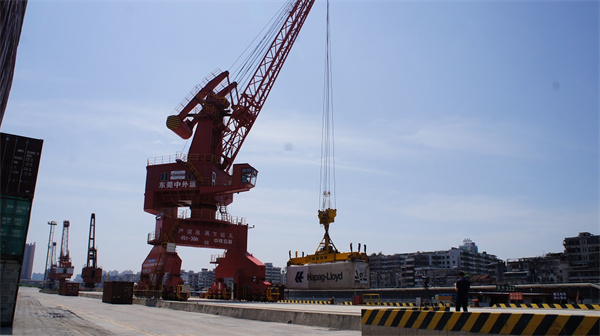 18日上午,14個載有瓷餐具、瓷製儲物罐等貨物的集裝箱在廣東東莞石龍港辦結通關手續,經由駁船運至深圳蛇口,在蛇口港將直接搭上國際貨輪發往世界各地,這標誌着「深圳蛇口—東莞石龍」組合港項目正式啟動。