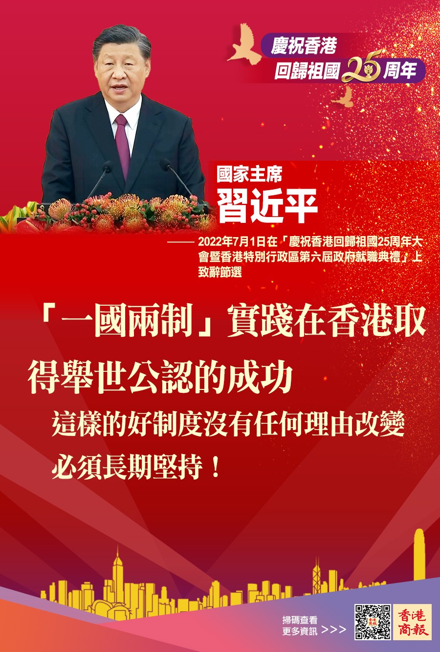 新華社香港7月1日電(記者陳鍵興 朱基釵 趙博)慶祝香港回歸祖國25周年大會暨香港特別行政區第六屆政府就職典禮1日上午在香港會展中心隆重舉行。中共中央總書記、國家主席、中央軍委主席習近平出席並發表重要講話。他強調,25年來,在祖國全力支持下,在香港特別行政區政府和社會各界共同努力下,「一國兩制」實踐在香港取得舉世公認的成功。「一國兩制」是經過實踐反覆檢驗了的,符合國家、民族根本利益,符合香港、澳門根本利益,得到14億多祖國人民鼎力支持,得到香港、澳門居民一致擁護,也得到國際社會普遍贊同。這樣的好制度,沒有任何理由改變,必須長期堅持。