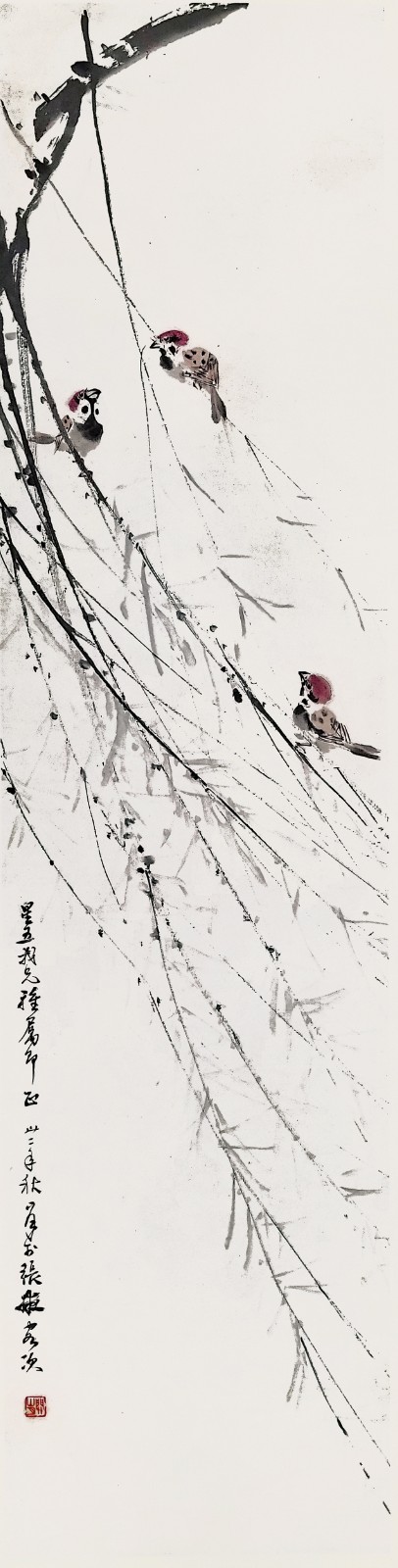1939年秋,關山月踏上旅行寫生之路,他自廣東出發,踏遍西南,走進西北,深入生活,收集素材,邊寫生邊創作,這段旅途為他後來的藝術成就奠定了堅實的基礎。《柳雀》創作於1943年,旅途的寫生見聞令他開闊了眼界,他秉承恩師高劍父「折衷中西,融匯古今」的藝術主張,繼承了中國寫意畫以水墨為主的風格,借鑒古代壁畫中人物畫的技法,同時吸收了西畫的寫實手法。畫中的柳條纖細柔韌,線條細如游絲,剛勁如鐵線,有高古之意;遠處的枝條用淡墨帶出,層次豐富,有強烈的空間感。枝頭的麻雀以水墨表現為主,幾筆暈染出麻雀蓬鬆的羽毛和圓潤靈巧的身體,白色羽毛的部位留白處理,羽翼邊沿稍作勾勒,造型靈動自然。他在注重傳統寫意畫「傳神達意」的同時,採用了西畫中的焦點透視,麻雀在俯仰之間結構透視隨之變化,營造出一種空間的真實感。此作品畫面雖簡潔,但細節處耐人尋味,有很強的感染力,可謂神完氣足。