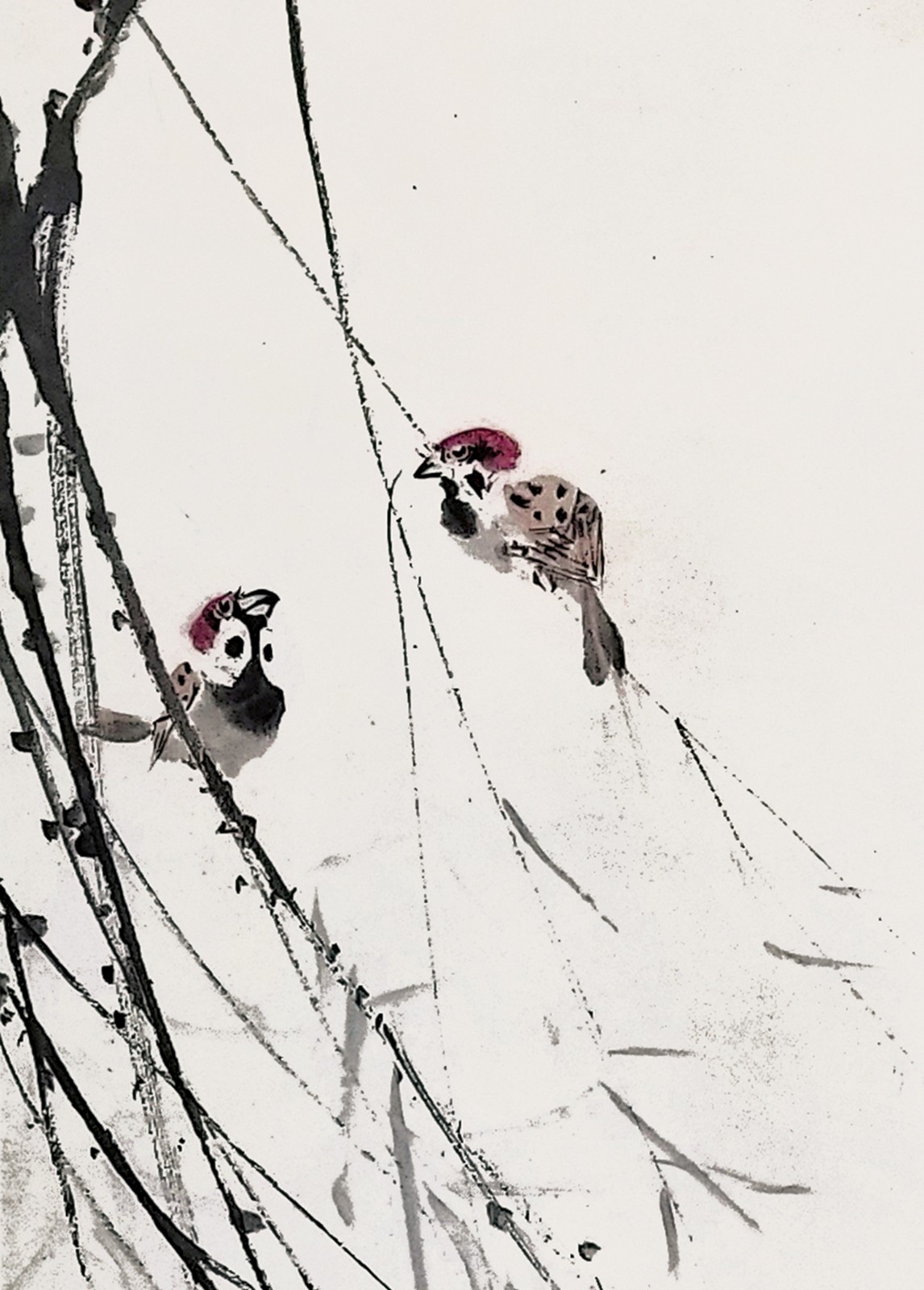 關山月在藝術上堅持嶺南畫派的革新主張,追求畫面的時代感和生活氣息。麻雀是花鳥畫中常見的鳥類,它顏色樸素,又有斑紋,可謂文質皆備,雅俗共賞。名家筆下的麻雀風格各異:徐悲鴻樸實無華,唐雲冷峭靈奇,齊白石爐火純青。而關山月筆下的麻雀生動可愛,造型簡練,色彩鮮豔,情態各異。麻雀頭部的那一抹紅色分外耀眼,仿佛俏麗的帽子。頸部有一圈白色的羽毛,喙部下方一道黑色的帶狀花紋和腹部相連,兩側分別有一塊黑色的圓形斑紋。腹部的羽毛是較淺的灰色,尾羽高高翹起,盡顯活潑靈動。