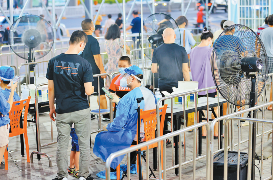 ▲7月23日,羅湖區筍崗街道湖景社區核酸採樣點布置多颱風扇,為堅守崗位的防疫工作人員消暑降溫。深圳晚報記者 陳玉 攝