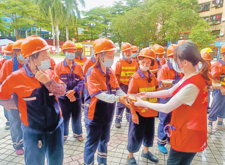 ▲環衛工人接過街道送來的解暑綠豆湯。受訪單位供圖