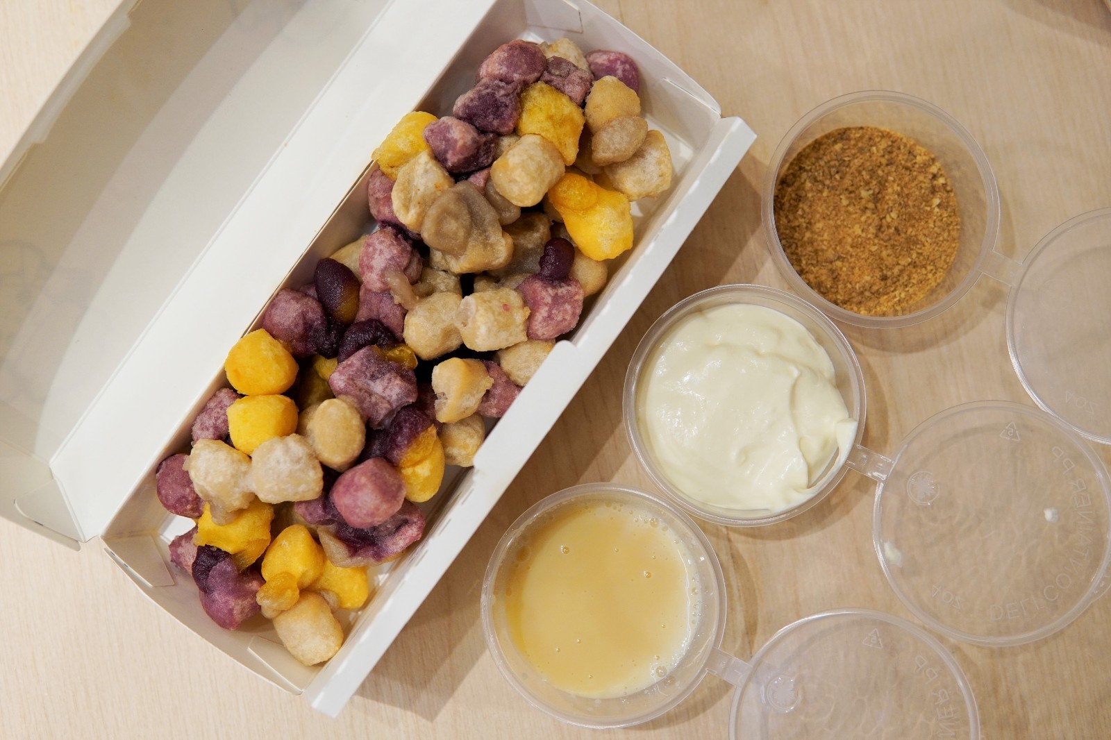 「狂人炸芋圓」的芋圓外層香脆內裏軟糯,配合不同醬料甜而不膩,HK$45。