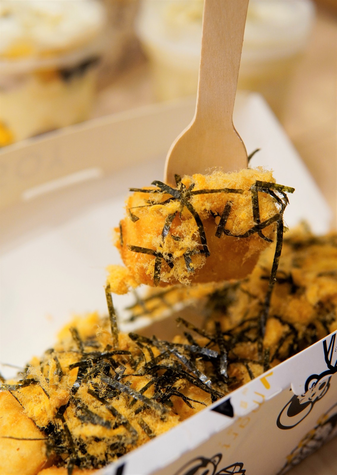 「海苔肉鬆脆皮木棉豆腐」,HK$40。此小食是阿瑋根據小時候婆婆的秘方去製作木棉豆腐,因此豆腐帶點懷舊的味道。
