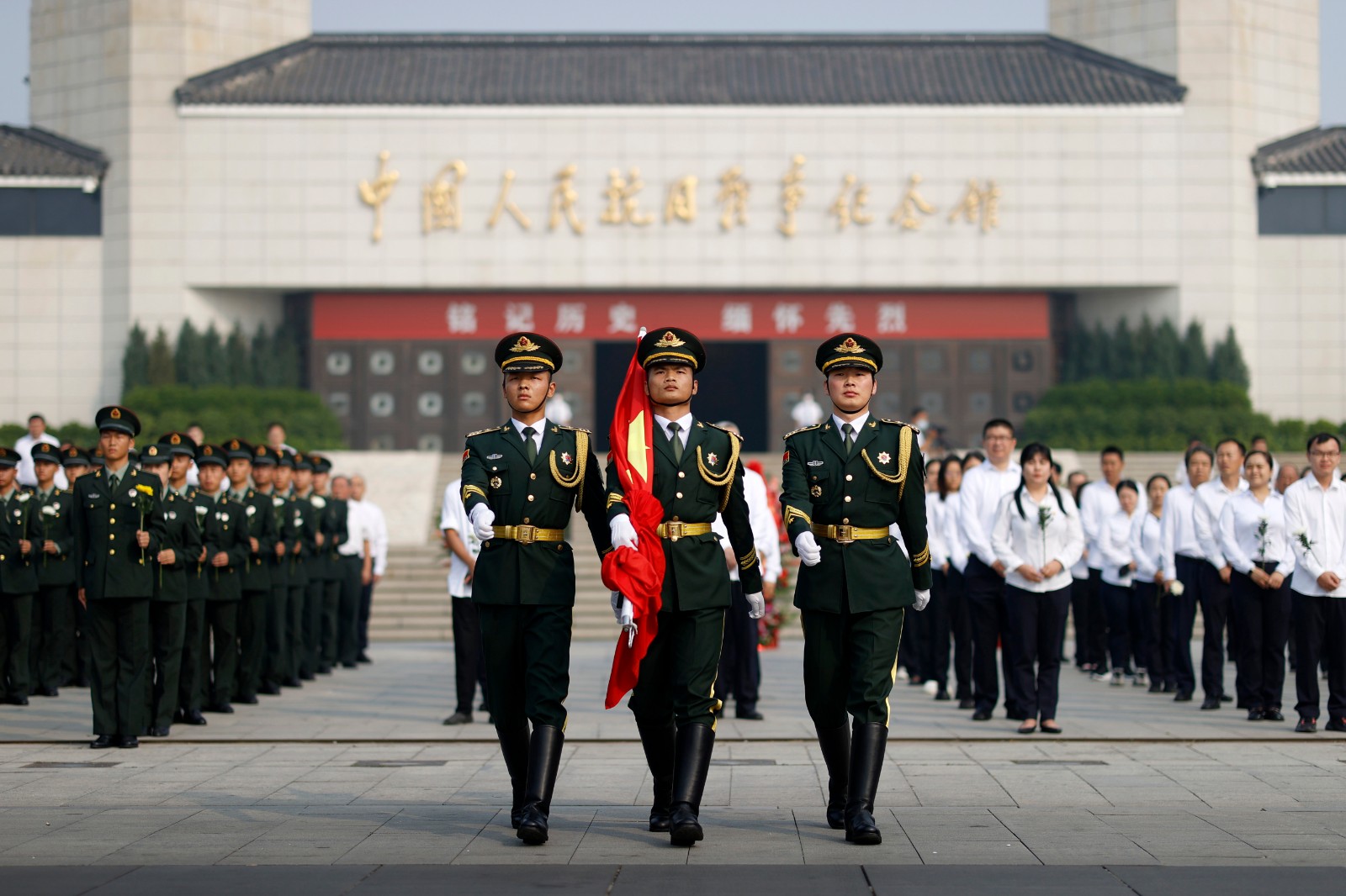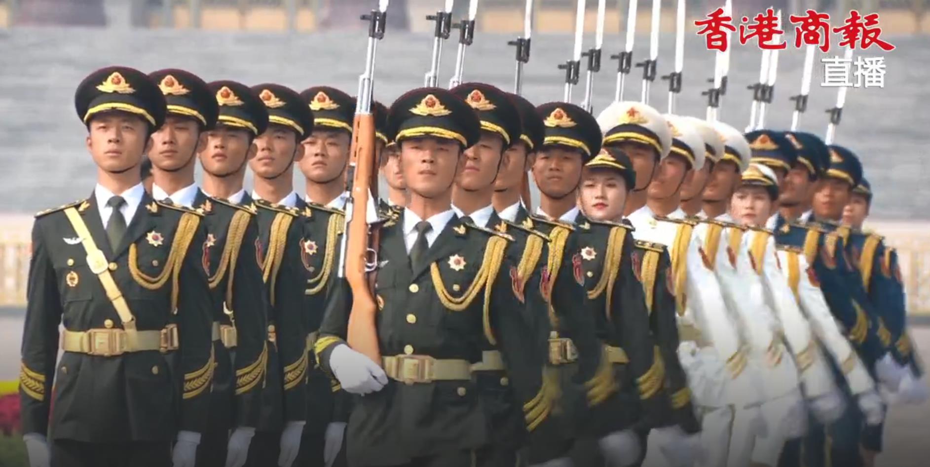 「禮兵就位!」隨着號令,三軍儀仗兵邁着鏗鏘有力的步伐,正步行進到紀念碑前持槍佇立。