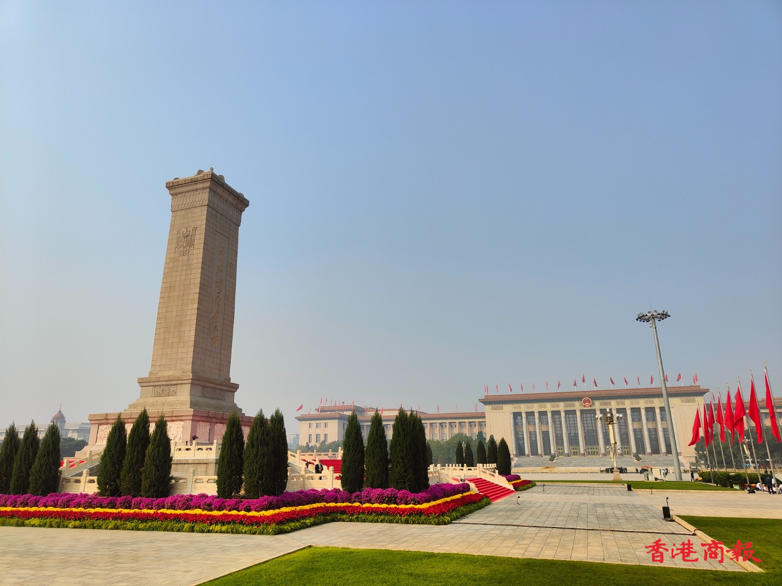 壯闊的天安門廣場上,鮮豔的五星紅旗高高飄揚,人民英雄紀念碑巍然聳立。廣場中央,「祝福祖國」巨型花籃表達着對國家繁榮富強的美好祝願,花籃上「喜迎二十大「的字樣傳遞着全黨全軍全國各族人民對黨的二十大勝利召開的熱切期盼。