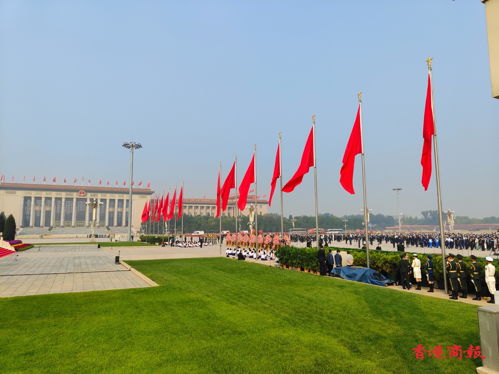 10時整,向人民英雄敬獻花籃儀式開始。軍樂團奏響《義勇軍進行曲》,全場齊聲高唱中華人民共和國國歌。
