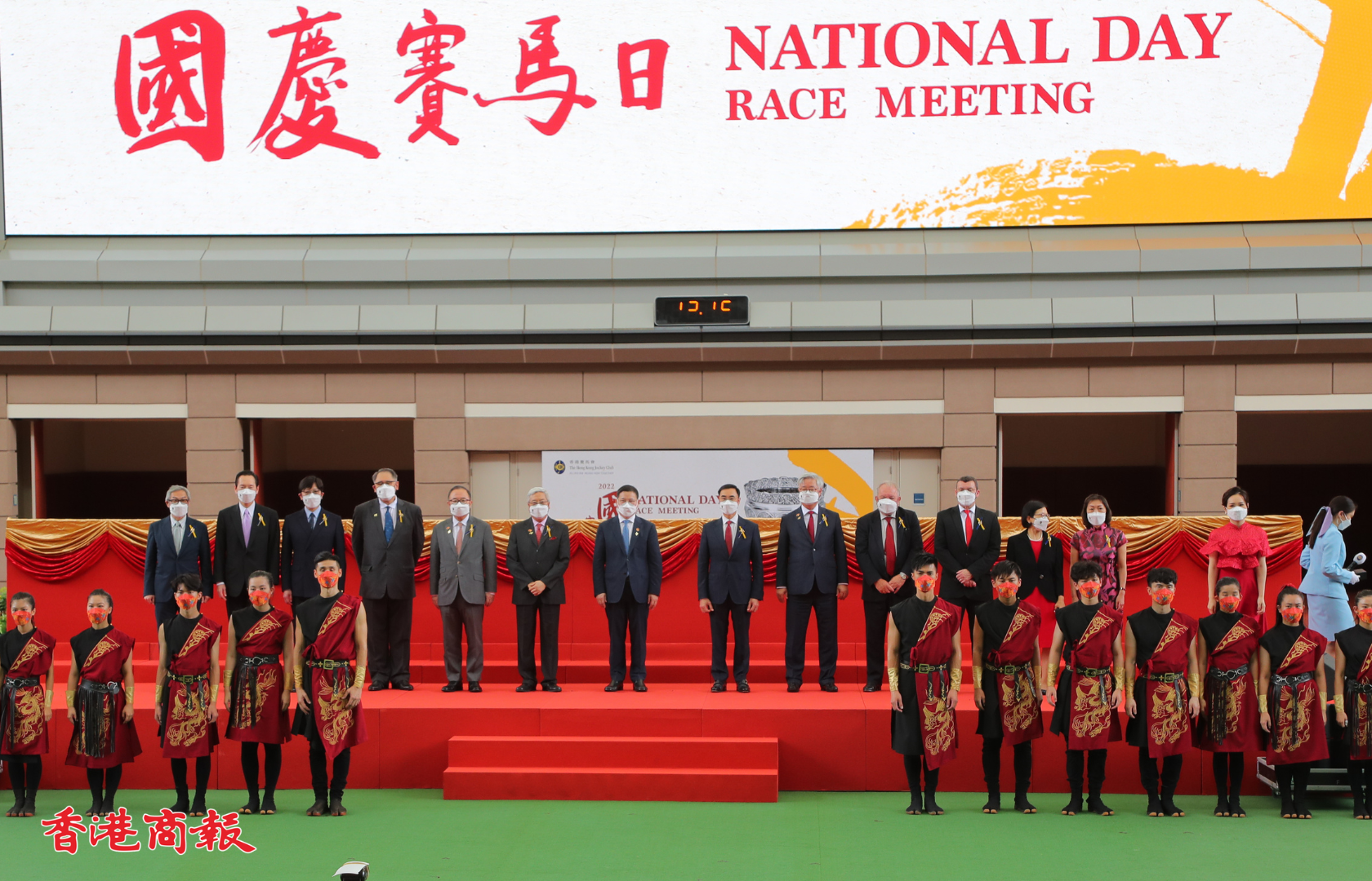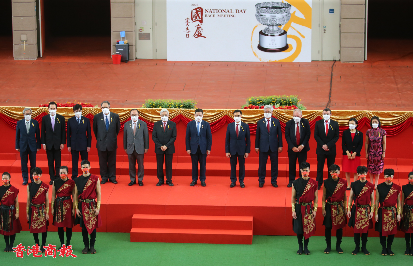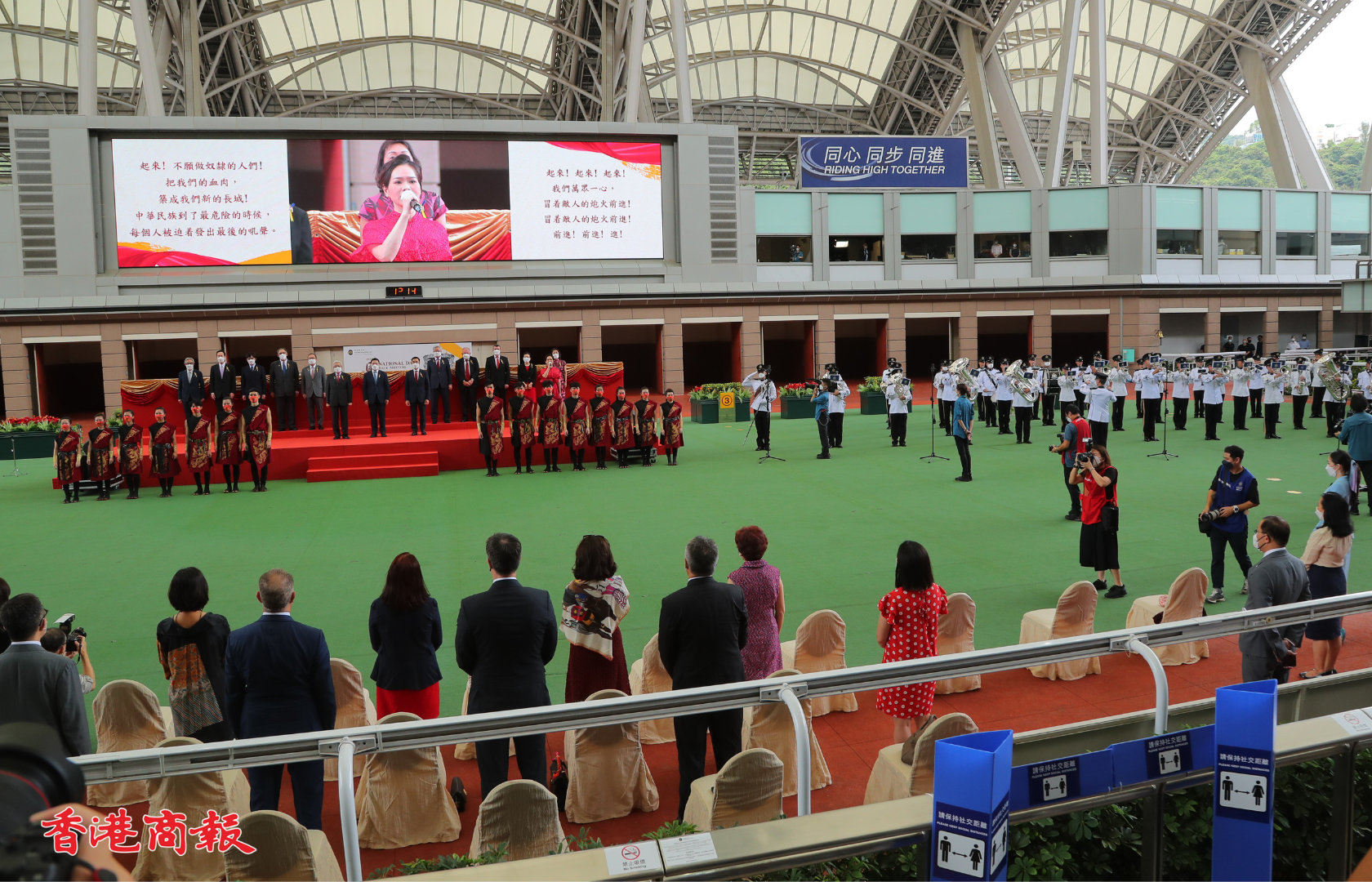 國慶賽馬日今日(1日)在沙田馬場上演,開幕匯演於馬匹亮相圈舉行,中央人民政府駐香港特別行政區聯絡辦公室宣傳文體部副部長張國義、香港賽馬會主席利子厚及一眾董事一同為開幕儀式主禮。