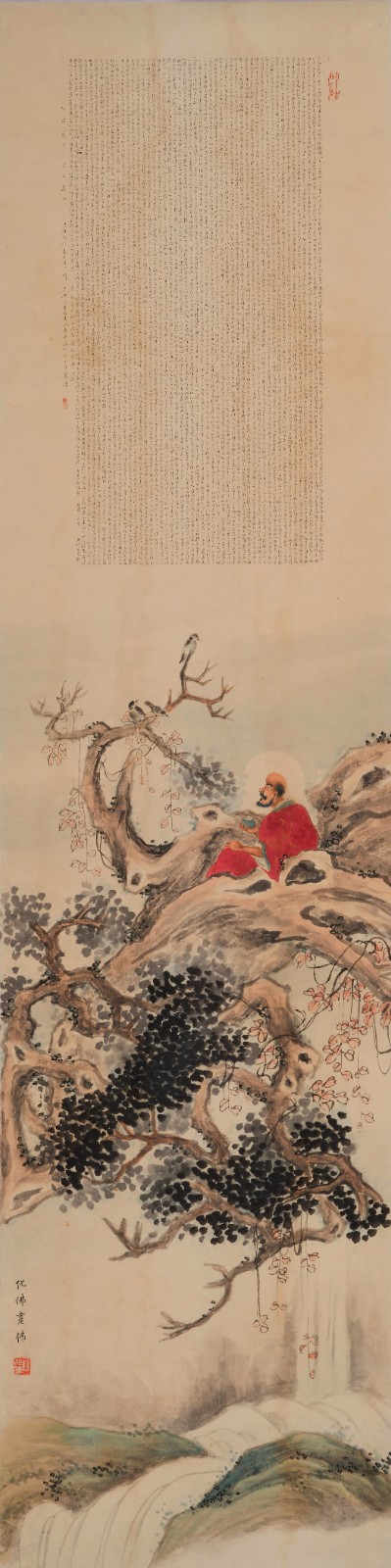 錢化佛畫作格局出入宋畫,人物取法梁楷、陳老蓮,樹法多用丁雲鵬、吳彬畫法,可謂師出有門。畫中紅衣羅漢坐於懸空巨木間,前額高凸,虯鬚密髯,但眉目慈祥,面含笑意,有慈悲之感。開臉不同於清末民初畫家慣常的開臉法,具有寫實意味。樹木盤根錯節,山石青綠相間,羅漢一襲紅衣的朱砂色用得尤為精妙。藤蔓纏繞在枝幹上,為畫面增添幾許線性的靈動;墨筆點出茂密的樹葉,濃淡深淺皆有層次。畫面色彩搭配和諧,加上潺潺流水,更是超凡出塵,觀之令人身心舒暢。